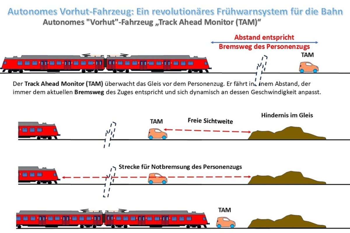 Tragische Zugunglücke, wie vor kurzem in Baden-Württemberg geschehen, die durch unvorhersehbare Ereignisse wie Hangrutsche und Steinschläge ausgelöst werden, führen uns immer wieder die Schwachstellen im Sicherheitsnetz der Bahn vor Augen. Solche Vorfälle, bei denen tonnenschwere Gesteinsmassen und Erdreich plötzlich auf die Gleise gelangen, stellen eine immense Gefahr für den Schienenverkehr dar. Während fest installierte Überwachungssysteme oft nur punktuell eingesetzt werden und ein flächendeckendes Sensorsystem für das gesamte Streckennetz der Bahn wirtschaftlich und technisch kaum realisierbar wäre, rückt eine innovative und mobile Lösung in den Fokus: ein autonomes "Vorhut"-Fahrzeug „Track Ahead Monitor (TAM)“.