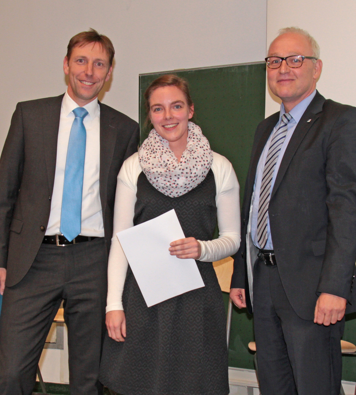 Ulf Meyer-Dietrich und Dr. Stefan Ostrau überreichten je einen Preis im Studiengang Vermessung an Annemarie Reusch, B. Eng. und im Studiengang Geoinformatik an Annette Becker, B. Eng. als beste Absolventin. Sie würdigten damit ein schnelles Studium mit sehr gutem Abschluss.