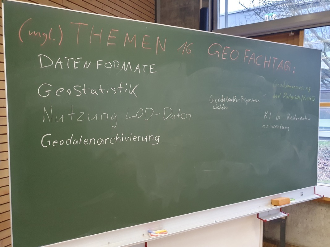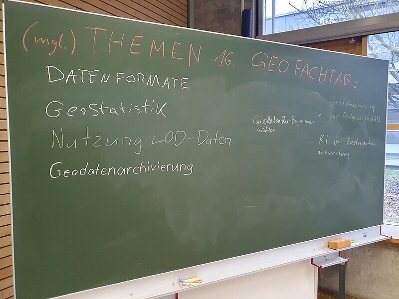 Am Ende der Veranstaltung blieb noch Zeit für einen Ausklang, um sich über die vielen, spannenden Themen auszutauschen und das eigene Wissen über das persönliche Fachgebiet hinaus zu erweitern. Eine herrliche herkömmliche (Daten-)Erfassung an einer analogen Tafel mit Kreidestiften sammelte Ideen der Teilnehmer für den 16. Geofachtag im Jahr 2025 vermutlich wieder Mitte Februar.