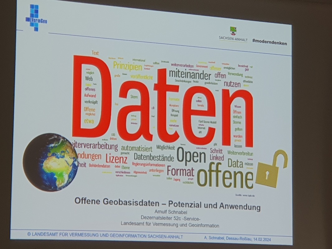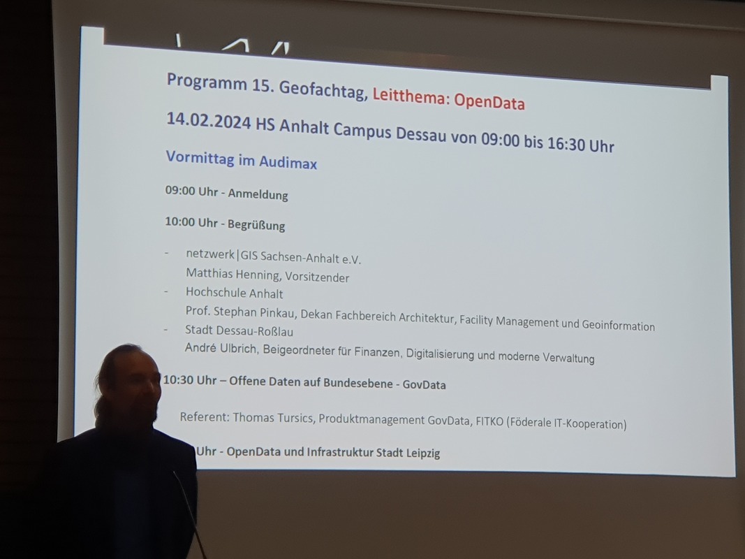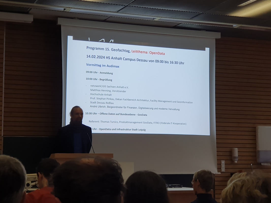 Am 14.02.2024 fand in Dessau-Roßlau im audimax der Hochschule Anhalt (Campus Dessau) der 15. Geofachtag Sachsen-Anhalt des Vereins netzwerkGIS e.V. in Kooperation mit dem BILDUNGSWERK VDV statt. Leitthema des diesjährigen Geofachtages war OpenData.