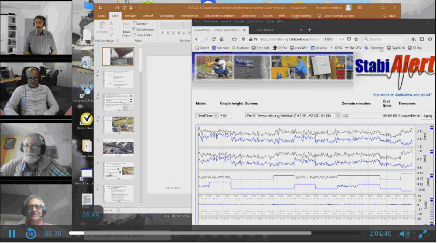 Im Rahmen einer Videokonferenz wird über ein Projekt mit geodätischem Monitoring an einer Brücke für die U-Bahn im zentralen Bereich von Berlin berichtet. In kurzen Video-Sequenzen wird die Baustelle vorgestellt. Das Besondere an dem Projekt sind die enorm hohen Anforderungen hinsichtlich der Genauigkeit für die 3D-Überwachung. So besteht z. B. die Notwendigkeit relative Höhenveränderungen an zwei Lagerpunkten auf einer Pendelstütze zu überwachen. Als Alarmwerte bei Überschreitung für den Höhenunterschied ist der Vorwarnwert 2,5mm und als Grenzwert 3mm angesetzt. Bei Überschreitung des Grenzwertes wird der U-Bahnverkehr auf der Strecke eingestellt. Da ist dann ein Schienenersatzverkehr im zentralen Bereich von Berlin mit verbunden.