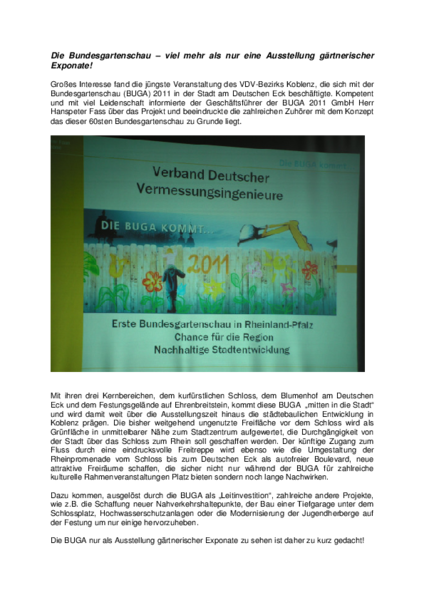 Großes Interesse fand die jüngste Veranstaltung des VDV-Bezirks Koblenz, die sich mit der Bundesgartenschau (BUGA) 2011 in der Stadt am Deutschen Eck beschäftigte. Kompetent und mit viel Leidenschaft informierte der Geschäftsführer der BUGA 2011 GmbH Herr Hanspeter Fass über das Projekt und beeindruckte die zahlreichen Zuhörer mit dem Konzept das dieser 60sten Bundesgartenschau zu Grunde liegt.