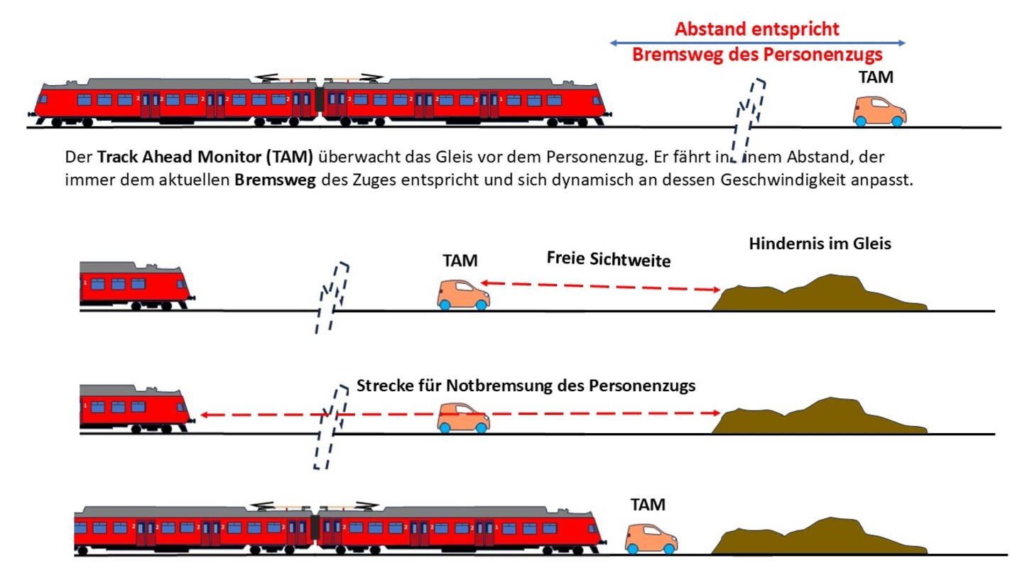 Das System agiert hier als präventive mobile Aufklärungseinheit. Während stationäre Sensoren an bestimmten Gefahrenstellen nur bedingt flächendeckend und kosteneffizient installiert werden können, bietet das Vorhut-Fahrzeug eine dynamische Überwachung des jeweils relevanten Streckenabschnitts. Es ist darauf ausgelegt, alle Arten von Material (Steine, Erdreich, umgestürzte Bäume etc.), die durch einen Hangrutsch oder Steinschlag auf die Gleise gelangt sind, zu identifizieren. Der TAM soll eine autonom arbeitende Einheit sein. Entsprechende Entwicklungen können genutzt werden.