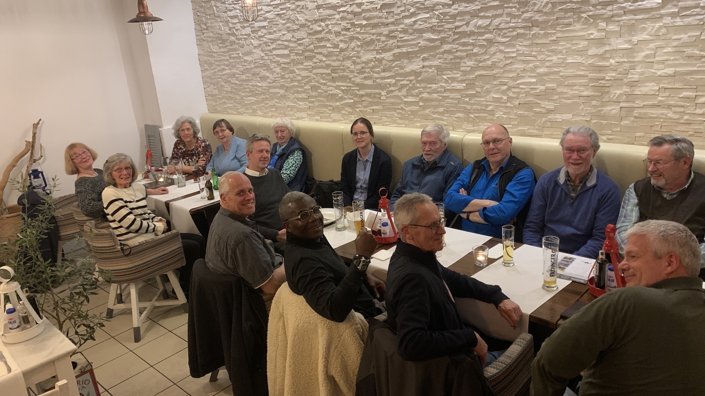Eine erfreulich hohe Teilnehmerzahl bestätigte, dass die reale Welt im Bezirk Essen noch lebt. Die Tische mussten zusammengerückt werden und wer auf der langen Bank Platz genommen hatte, war zwar ein wenig in seiner Bewegungsfreiheit eingeschränkt, aber das störte nicht wirklich. Es entwickelten sich schnell intensive Gespräche, die den Raum auch akustisch füllten. Letztlich zeigte sich aber, dass unser langjähriger Treffpunkt im Haus Wilmes (wurde leider wegen eines Todesfalls geschlossen), nicht so einfach zu ersetzen ist. Alternativ-Vorschläge sind deshalb willkommen.