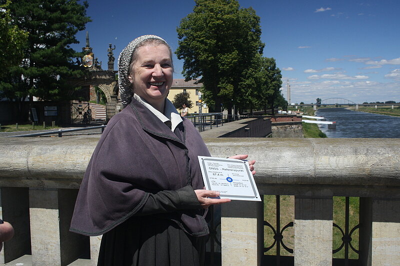 Als Höhepunkt der 14. Landesmitgliederversammlung übergab der VDV Sachsen nach der Mittagspause ein Präsent für die Stadt Torgau stellvertretend an „Herr Käthe“. Mittels einer vom VDV gefertigten Tafel kann man zukünftig am alten südlichen Brückenkopf der alten Elbbrücke, der direkt unterhalb von Schloss Hartenfels liegt, mit einem geodätischen Referenz- und Kalibrierungspunkt den GPS-Empfänger seines Smartphones überprüfen.