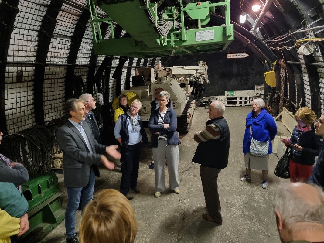 Gut gestärkt ging es weiter durch den ca. 2,5 km langen Untertagebereich. Imposante Maschinen teilweise auch mit Betriebsvorführung säumten den Weg der Besichtigung. Erst nachdem im Maschinenraum das Steigerlied gesungen wurde (mit anschließendem Schnaps) ging es wieder nach Übertage.