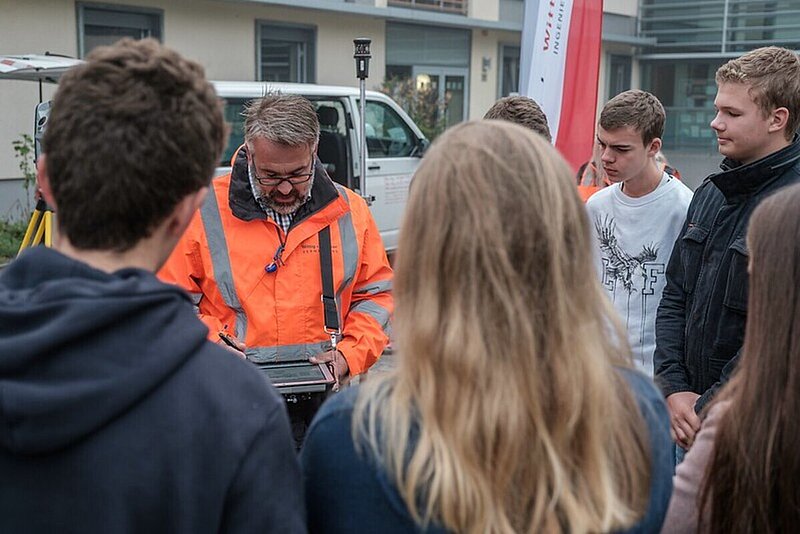 Auf dem Schulgelände präsentierte Hörl moderne Vermessungsinstrumente und erklärte die Handhabung eines elektronischen Tachymeters mit Tablett und einen GPS Empfänger (GNSS).