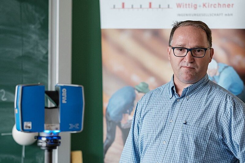 Im Anschluss zeigten die Mitarbeiter Dipl.-Ing. Andreas Hörl und Dipl.-Ing. Oliver Stöppler vom Vermessungsbüro ÖbVIs Wittig und Kirchner modernste Sensoren / Vermessungsgeräte in der praktischen Anwendung der Weltvermesser. Stöppler stellte den Einsatz eines Laserscanners vor und erläutert die Aufnahmetechnik und Auswertung anhand von abgeschlossenen Projekten. Ein Scan des Klassenzimmers war eine Selbstverständlichkeit.