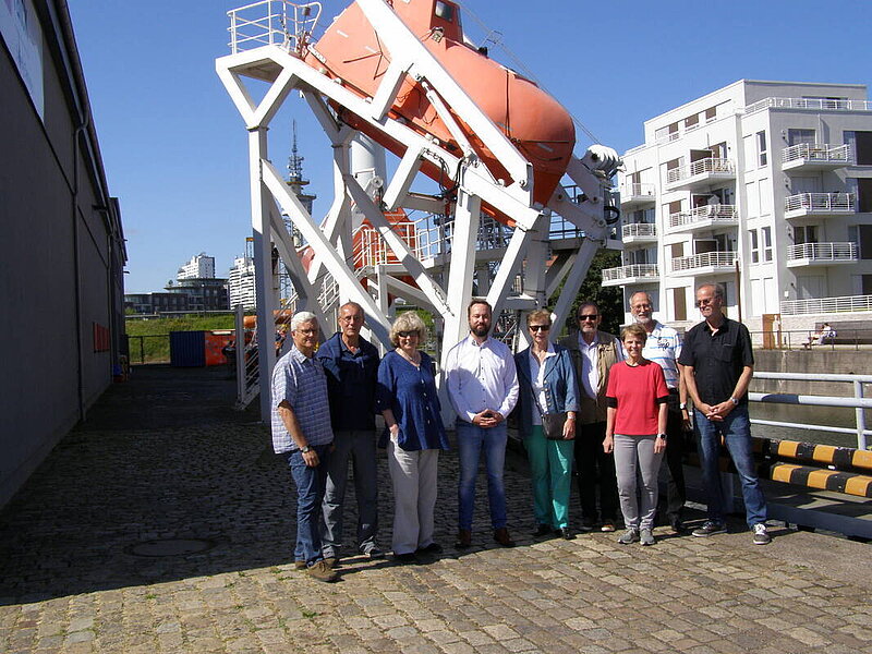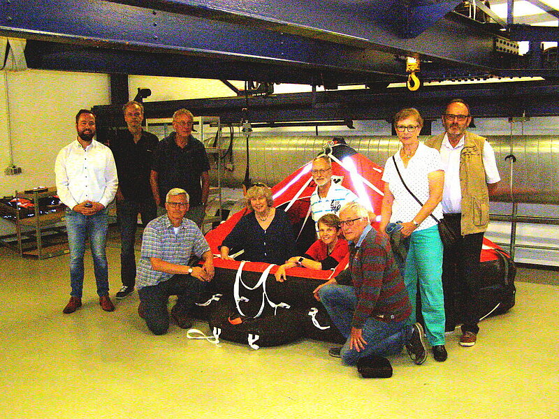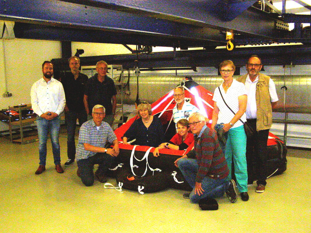 Nach einer kurzen Pause, in der Herr Engelbart diverse Fragen beantwortete, starteten wir unseren Rundgang. In der „Kleiderkammer“, dem Aufbewahrungsraum der Rettungsanzüge, erfuhren wir, dass diese nicht ganz preiswert sind, ständig auf Dichtigkeit überprüft und nach ca. einem halben Jahr erneuert werden. Von hier gingen wir zur „Schwimmhalle“ mit einem Wasserbecken, in dem mit Hilfe eines mechanisch zu bewegenden großen Balles ein realistischer Seegang erzeugt wird. Eine an einem aufwendig konstruierten Gestänge befestigte Kapsel (könnte ein Helikopterrumpf sein) wird hiermit unter Wasser gedrückt und es können Bewegungen der Kapsel mit der Vorrichtung realistisch erzeugt werden.