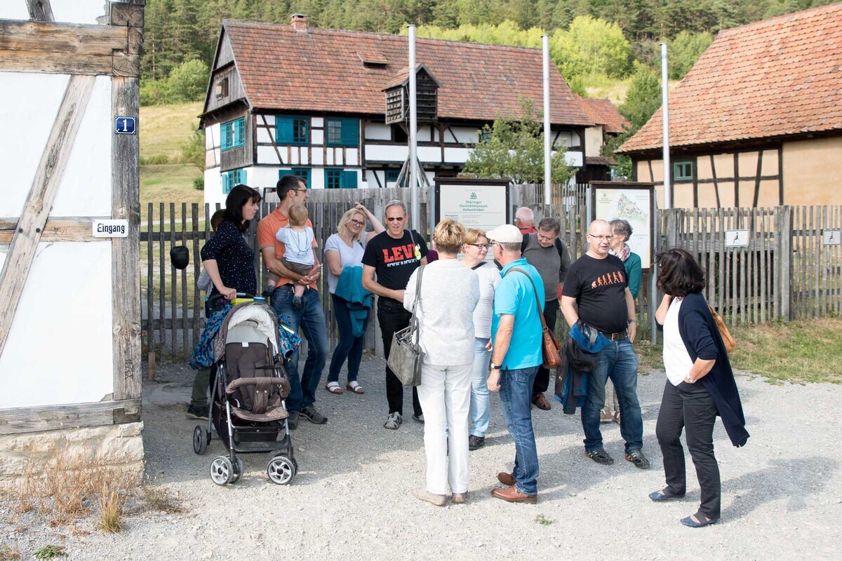 Das Sommerfest in Hohenfelden im Weimarer Land, südlich der Landeshauptstadt, war wie im letzten Jahr gut besucht. Treffpunkt war der Eingang des Freilichtmuseums am Eichenberg, außerhalb der Ortslage Hohenfelden. Unter fachkundiger Führung der Museumsleiterin Franziska Zschäck besichtigten die Teilnehmer ausgewählte Objekte auf dem Gelände. Die aus verschiedenen Teilen Thüringens hierher versetzten Gebäude wurden originalgetreu nach bauhistorischen Dokumentationen und Forschungen zur Bewohnergeschichte restauriert. Das Handwerk und die Lebensgeschichte der damaligen dörflichen Bevölkerung waren detailreich zu erfahren. Im Einzelnen wurden die noch immer funktionsfähige Blumentopf-Töpferei aus dem nahen Tonndorf, die 1729 erbaute Bockwindmühle aus Großmehlra, Unstrut-Hainich-Kreis, das Wohnstallhaus mit bis zu 50 cm dicken Lehmwänden aus Utzberg bei Erfurt, das Umgebindehaus aus Langenbuch, Saale-Orla-Kreis, und der ganz aus der Nähe stammende Gügleber Hof besucht. Die Gebäude stammen alle aus dem 17. Jahrhundert. Der Veranstaltungssaal in der Scheune aus Wüllersleben, Ilm-Kreis, war bereits Ort einer VDV-Veranstaltung im Jahr 2007. Weitere zum Museum gehörende historische Stätten in der Ortslage wurden im vergangenen Jahr besucht. Zur ganzheitlichen Präsentation des Museumsgeländes gehört auch, dass die Gebäude mit Gärten, Wiesen und Äckern umgeben sind und verschiedene Nutztiere darauf gehalten werden. Neben Handwerkertagen, Sonderausstellungen und historischen Führungen bietet das Museum Sonntags- und Ferienaktionen für Kinder an. Das Thüringer Freilichtmuseum feiert in diesem Jahr sein 40-jähriges Bestehen. Frau Zschäck ist stolz auf einen wachsenden Gebäudebestand.