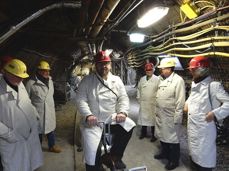 Hier vermittelten die Arbeitsgeräusche der schweren Maschinen einen Eindruck von der auch heute noch harten Arbeit unter Tage. Nach kurzer Einweisung konnten die Teilnehmer die an Deckenschienen aufgehängte Dieselkatze, das Grubenfahrrad, die Pressluft-Bohrmaschine oder den Elektroradlader ausprobieren.
