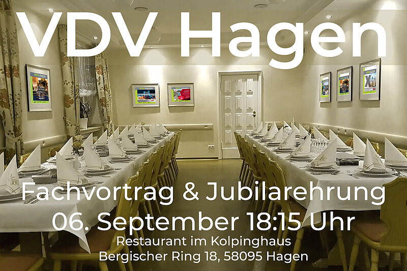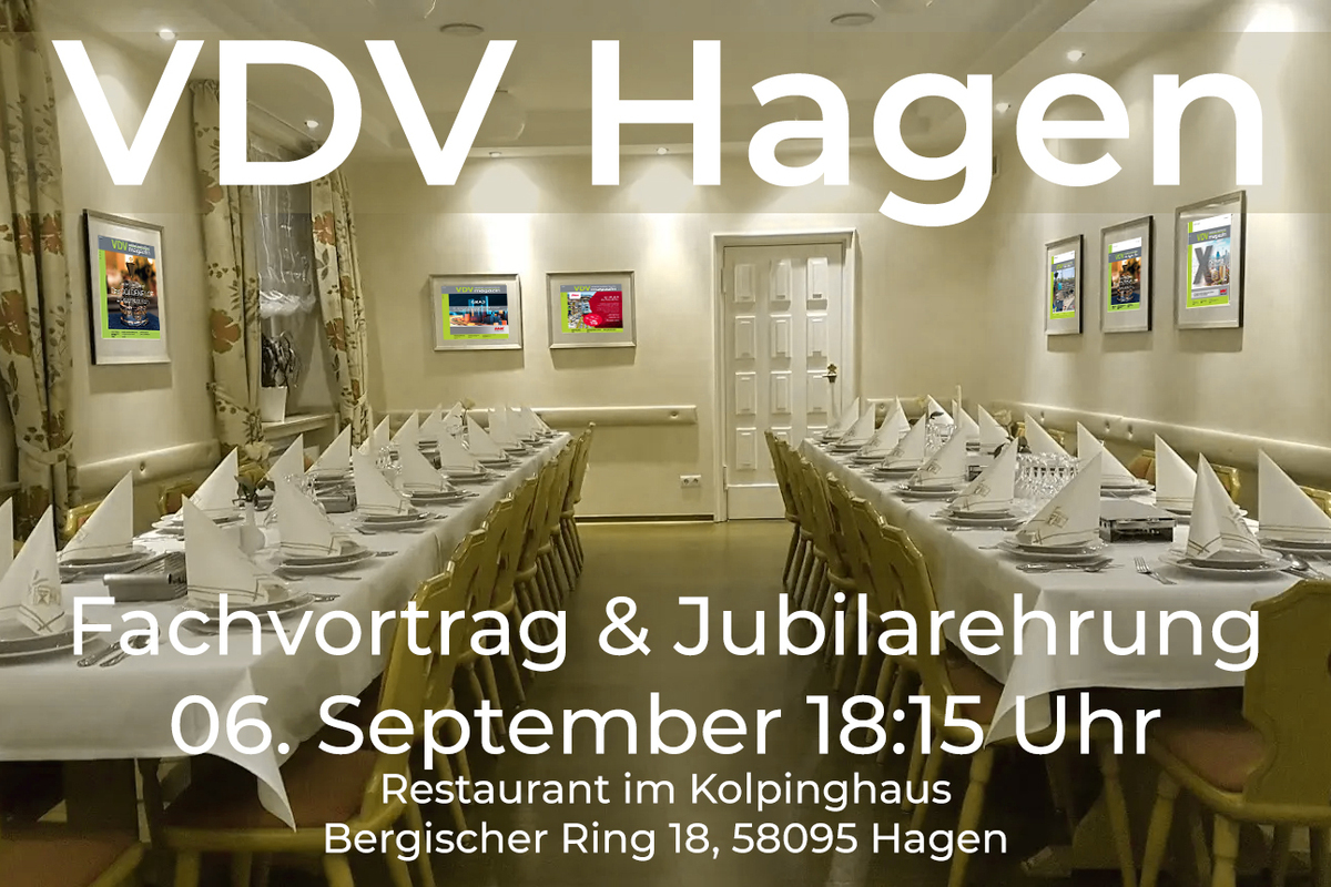 Am Mittwoch, dem 06.09.2023 fanden im Hagener Restaurant Kolpinghaus die Ehrungen für langjährige VDV-Mitglieder Bezirks Hagen statt.