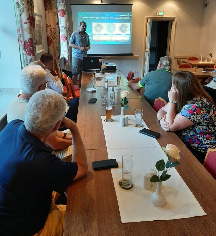 Aufgrund der „Corona-Jahre“ zuvor konnten einige ausstehende Jubilarehrungen bis dahin leider nicht durchgeführt werden. Um der einberufenen Veranstaltung einen gebührenden Rahmen zu verleihen, wurde sie mit einem vermessungstechnischen Fachvortrag kombiniert. Der Kollege Marten Krull, Inhaber der Hagener Firma Ingenieurvermessung-3D und in Person zugleich auch VDV-Mitglied im Bezirk Hagen, konnte im Vorfeld für eine sehr interessante Präsentation gewonnen werden. Seine Vorstellung des Themas „UAS-Photogrammetrie & -Laserscanning im Ingenieur- & Wasserbau – Anwendungsbeispiel Glörtalsperre“ beeindruckte die ca. anderthalb Dutzend anwesenden VDV-Mitglieder, von denen einige sogar aus Nachbarbezirken angereist waren. Auf den Fachvortrag folgte eine rege Fragerunde bzw. ein verbaler Austausch unter den anwesenden Mitgliedern, wodurch sich zeigte, wie ausgeprägt sich das fachliche Interesse der Kollegen/innen am vorgestellten Thema darstellte.