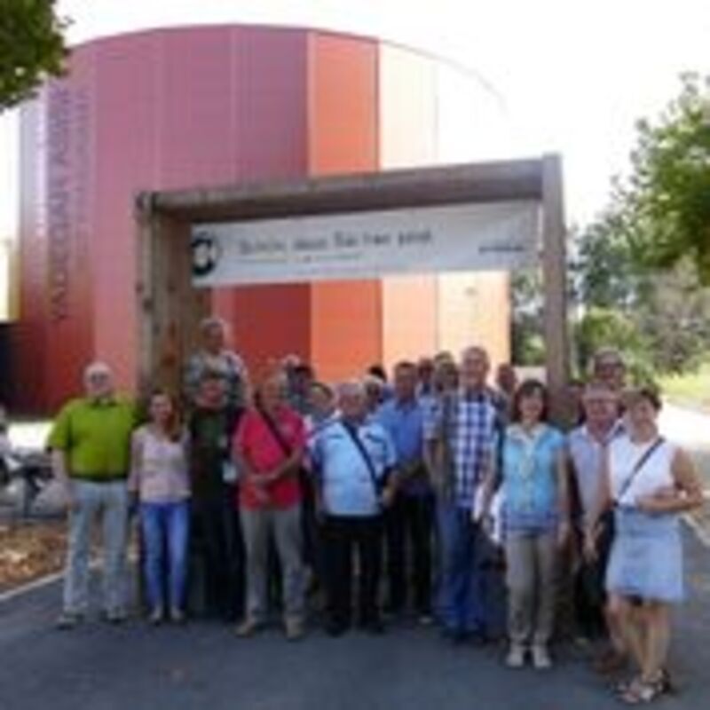 Der letzte Programmpunkt war das Asisi Panorama mit Individueller Führung. Wer sich darunter nur ein großes Bild vorstellt wurde schnell eines Besseren belehrt. Die Führung hier war aufgrund des großen Besucherandrangs leider etwas hektisch. Das Panoramabild mit Licht und Toneffekten war so eindrucksvoll, dass die Teilnehmer noch länger blieben um alles nochmal genau zu betrachten. Die abgebildeten Personen sind reale Personen, die in historischen Kleidern fotografiert wurden und vom Künstler in das historische Gemälde eingefügt wurden. Die Lichteffekte (Tag und Nacht) sind sehr stimmungsvoll eingerichtet, so dass man z. B. den Eindruck hatte, dass das Licht durch die bunten Fenster der Schlosskirche scheint. Die Toneffekte machen einen Ausflug nach Wittenberg zu Luthers Zeiten möglich. Das Programm war nun beendet – es war noch eine Schifffahrt auf der Elbe geplant. Dieser Punkt musste wegen absolutem Niedrigwasser entfallen. Viele Teilnehmer gingen noch einmal quer durch die Stadt zu einer Eisdiele. Hier saßen wir im Schatten der Schlosskirche noch einmal zusammen und ließen den Tag entspannt ausklingen.