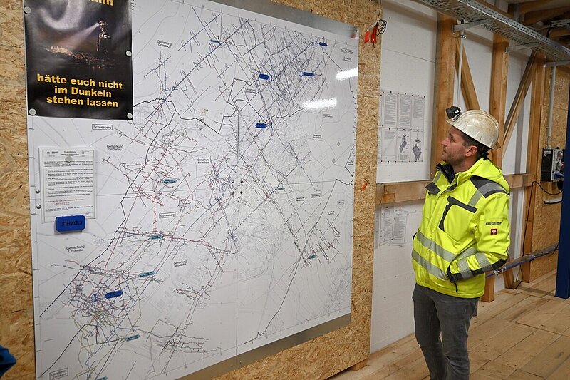 Versatzmassen wurden nach dem Sprengen der Betonplombe nicht angetroffen. Die Bergsicherung Schneeberg GmbH & Co. KG sichert den Schacht Meter für Meter im Zweischichtbetrieb mit Stahlrahmen und Spritzbeton bis in eine Tiefe von 100 m. Momentan ist eine Tiefe von 50 Metern erreicht, in die wir vom Rand der Öffnung mit großem Respekt hinunterblicken durften. Das s.g. „Fürstenstolln“- Niveau soll im April 2023 erreicht werden.