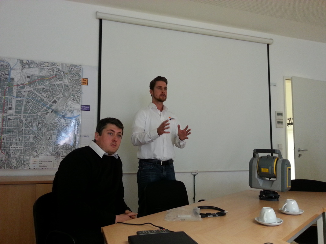 Bezirksvorsitzender Gerhard Vaupel begrüßte die Teilnehmer und beschrieb kurz einige Aspekte der Veranstaltung: ‚Unsere heutige Exkursion ist darauf angelegt, gerade auch Nachwuchs-Geodäten mehr Vermessungspraxis anzubieten. Wenn man auf die Neuordnung der Ausbildungsberufe mit den Lehrzielen Vermessungstechniker und Geomatiker blickt, sind wir alle Fachleute für Geoinformationstechnologie. In der Fachrichtung Vermessung folgt der technologischen Entwicklung ein neues Verständnis von Erhebung, Analyse, Auswertung von Daten. ‚Alltägliche‘ Vermessungsausrüstungen werden - innerhalb der üblichen Arbeitsabläufe - über Lösungen für herkömmliche Aufgaben bis hin zu komplexen 3D-Modellierungen verfügen‘.