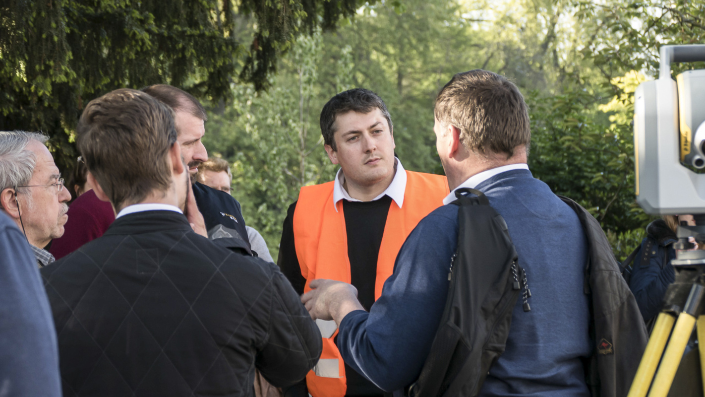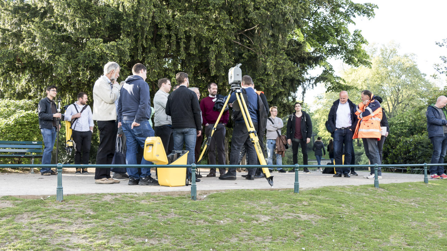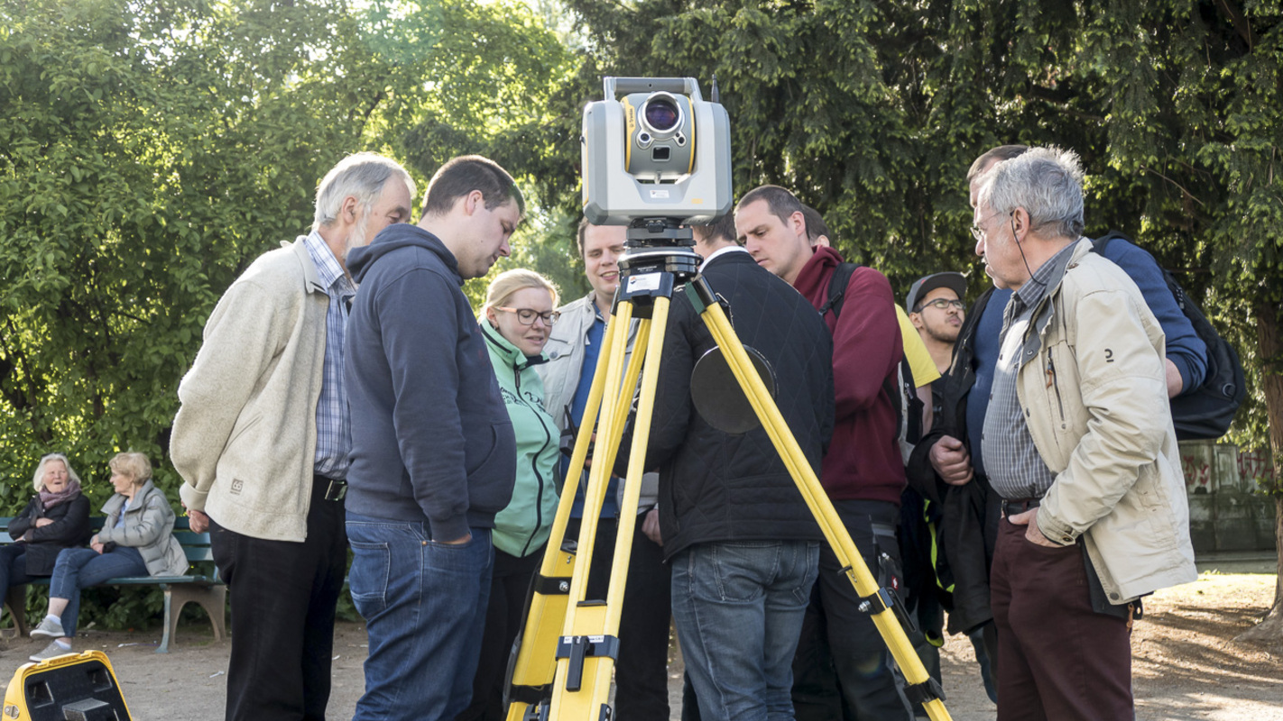 Als Vertreter dieser nächsten Generation vereint die TRIMBLE SX10 Scanning-Totalstation in sich das 3D-Scanning, eine Bilderfassungs- und Verarbeitungstechnologie und hochgenaue Totalstationsmessung (siehe auch Messebericht zur INTERGEO 2016, VDVmagazin 6/16, Seite 477). Damit der Messvorgang im Felde nachvollziehbar erlebt werden konnte, machten Vertriebsingenieur Sebastian Baum und Supporter Sascha Geisler von der Firma HERZOG Systemtechnik die Teilnehmer in einer kurzen Einweisung mit dem Instrument vertraut und fungierten danach als in allen Belangen sehr kompetente ‚Messtruppführer‘.