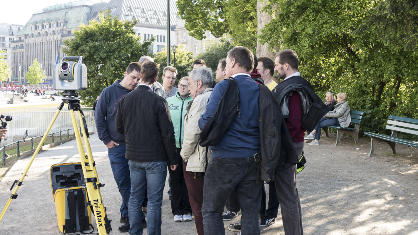 Die Mess-Objekte wurden bei Sonnenschein fußläufig in wenigen Minuten erreicht: Ein ‚Cut‘ in der Fassade und die Dachverbindung über der Piazza des Kö-Bogens (Architekt Daniel Libeskind), die ‚Goldene Brücke‘ zum Hofgarten mit ihren Jugendstilelementen und die Gleise an dem neuen Rheinbahn-Haltepunkt waren in ihrer komplexen Formenvielfalt zu erfassen. Durch zwei verfügbare Messausrüstungen konnten sich die Teilnehmer nach fachlichem Interesse aufteilen und zwischenzeitlich auch wieder die Station wechseln. Jeder wurde angeleitet, den Mess- und Auswertevorgang im Felde selbst auszuführen, z. B. auf dem Feld-Tablet-PC die exakte Detail-Anzielung der Totalstation mittels Zoom direkt im Mess-Bild ausführen.