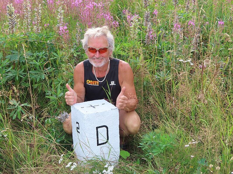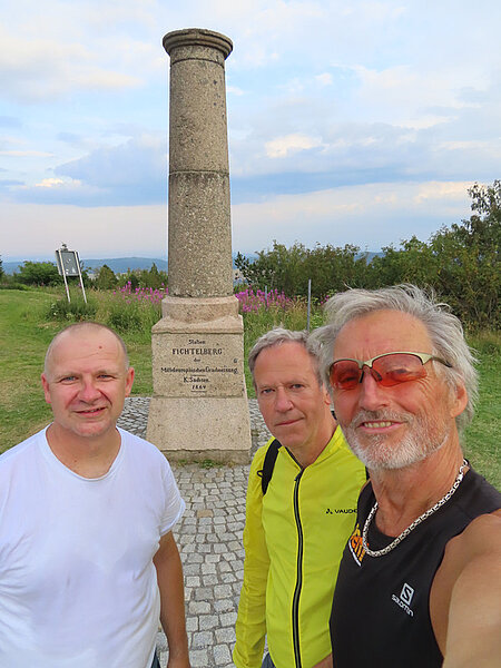Bei der Ankunft im Bahnhof verriet ein Schild die Höhenbolzen-Höhe von 893,962 m über NN am Bahnhofsgebäude. Die Überwindung des restlichen Höhenunterschiedes von über 300 Metern zum Fichtelberg blieb unseren Muskelkräften überlassen. Der Blick hinüber zum Keilberg (Klínovec) auf tschechischer Seite, mit 1244 m die höchste Erhebung des Erzgebirges, und der Anblick gut sichtbarer, teils perfekt erhaltener historischer Grenzmarkierungen an der Jahrhunderte alten, unveränderten Landesgrenze zwischen Sachsen und Böhmen, entschädigten für die mühevolle Auffahrt. Als erstes haben wir 3 Geodäten selbstverständlich der Königlich-Sächsische Triangulierung (hier mit dem historischen Eigennamen) Ehre erwiesen und die Station Nr. 15, Fichtelberg besichtigt. Deren Säule wurde wegen des Neubaus des Fichtelberghauses 1965 rund 80 m nach Süden verlegt. Der als Granitquader ausgelegte Vermessungspunkt ist nicht mehr vorhanden (51°05′39″ N, 12°28′51″ O).