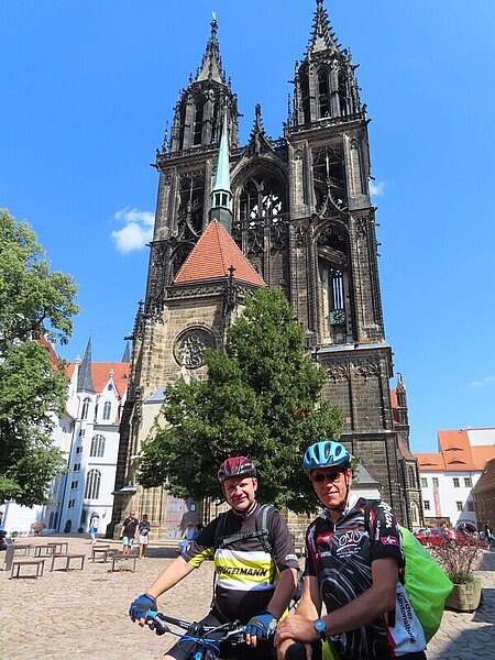 Die letzte Etappe verlief bei bestem Wetter überwiegend entlang des Elbe - Fahrradweges mit Rast in Meißen auf der Albrechtsburg. Auf linkselbischer Seite warfen wir einen senkrechten Blick in den 293 m tiefen „Hoffnungsschacht“ der ehemaligen „Grube Güte Gottes“, einst ein Silberbergwerk in Scharfenberg. Eine Personenfähre brachte uns samt Fahrräder auf das rechte Elbufer, um den malerischen Ort Altkötzschenbroda, ein Ortsteil von Radebeul, zu durchfahren. Der verdiente Abschluss der Tour war die Einkehr auf der Terrasse des historischen Ball- und Brauhauses Watzke im Dresdner Stadtteil Mickten. Bei hausgebrautem Bier und sächsischen Spezialitäten ließen wir die Tour Revue passieren und genossen den Blick über die Elbe auf die Silhouette der schon nahen barocken Altstadt von Dresden. Am Ende der Reise blieb der Fahrradkilometerzähler bei 260 km stehen.