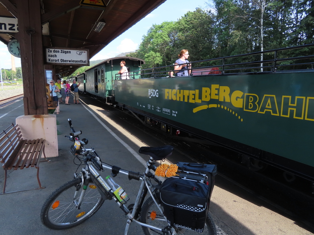 Vom Hauptbahnhof in Dresden gelangten wir am 13.08.2020 mit dem Regionalexpress der Sachsen-Franken-Magistrale über Freiberg/Sachsen nach Flöha. Nach Umstieg in Flöha ging es weiter mit der Erzgebirgsbahn im Zschopautal zunächst zum Bahnhof Cranzahl. Von dort aus wurde der Frei-Panoramawagen der Sächsischen Dampfeisenbahn Gesellschaft gebucht und die Fahrräder traditionell im Gepäck- und Postwagen verstaut. Die Fahrt mit der historischen Fichtelbergbahn, gezogen von einer alten Dampflokomotive auf Schmalspurstrecke weiter bis zum Endbahnhof Kurort Oberwiesenthal, der höchstgelegenen Stadt Deutschlands war bei strahlendem Sonnenschein ein wunderschönes, nostalgisches aber auch rußiges Erlebnis.