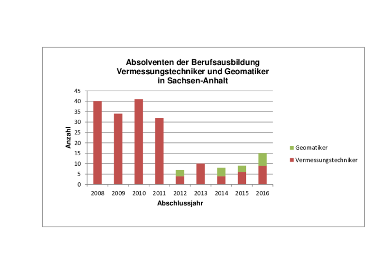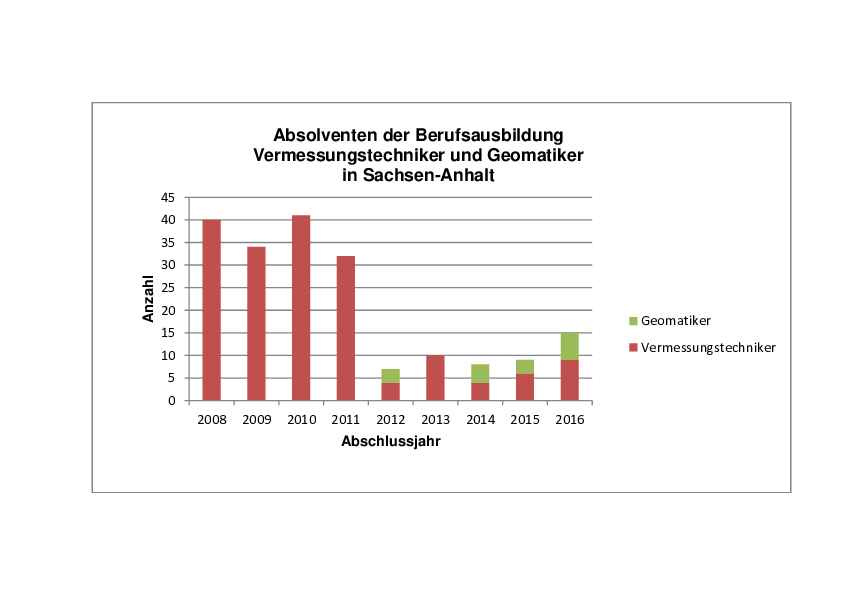Schon seit 2008 findet die Feierliche Zeugnisübergabe in Sachsen-Anhalt statt. Da ist es berechtigt einmal zurück zu blicken. 2010 wurde die neue Berufsordnung eingeführt und 2012 kamen die ersten Geomatiker bundesweit aus Sachsen-Anhalt. Ein schöner Erfolg der durch den Rückzug der öffentlichen Verwaltung aus Berufsausbildung im Jahre 2010 getrübt wurde. Seit 2013 wird nun auch im öffentlichen Dienst wieder ausgebildet. Zusätzlich mussten und müssen vielfältige Anstrengungen von verschiedenen Seiten unternommen werden um die Berufsausbildung in Sachsen-Anhalt zu erhalten. So engagiert sich z.B. der VDV-Landesverband regelmäßig bei Berufsbildungsmessen im Lande. Die Gefahr die Berufsausbildung der geodätischen Fachkräfte für immer in Sachsen-Anhalt zu verlieren scheint nun gebannt. Die Autonomie der Betriebe ist gewahrt, so dass weiterhin sowohl Vermessungstechniker als auch Geomatiker in Sachsen-Anhalt ausgebildet werden. In kürzlich durchgeführten Gesprächen (Verbändegespräch am 25.05.2016) konnte festgestellt werden, dass selbst bei voller Ausnutzung aller zurzeit vorhandenen Ausbildungsmöglichkeiten in nicht mehr allzu ferner Zukunft der Bedarf an geodätischen Fachkräften wahrscheinlich nicht mehr gedeckt werden kann.