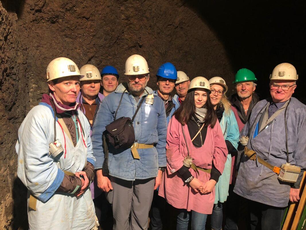 Christian Beßler vom Verein „Alte Hoffnung Erbstolln“ begrüßte uns im gemütlichen kachelofenbeheizten Hermannschachthaus und gab Kittel, Bergmannsgeleucht und Helme aus. Einen kurzen Überblick über die Geschichte des Blei- und Silberbergbaus in Schönborn-Dreiwerden bekamen wir im ersten Gebäude an der Scheidebank, an der mittels eines Hammers grob das Erz vom tauben Gestein getrennt wurde. Hier erfuhren wir, dass vom 14. Jahrhundert bis zum Ende des 19. Jahrhunderts Erz abgebaut wurde.