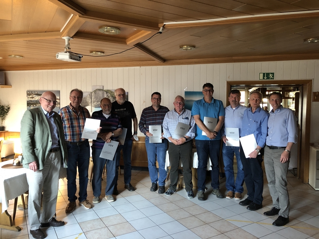 Im Anschluss an die Besichtigung konnte in der Nachbetrachtung noch vieles der letzten Jahre ausgetauscht werden. Zudem standen noch Ehrungen für langjährige Mitglieder an. Aufgrund der ausgefallenen Termine der letzten Jahre hatte sich dabei einiges angesammelt. So konnten Klaus Meyer-Dietrich als Ehren-Landesvorsitzender und der Bezirksvorsitzende Ulf Meyer-Dietrich zahlreiche Ehrungen vornehmen. Für 50-jahrige Treue zum VDV wurden Albrecht Riedel, Werner Lammers und Peter Sukkau geehrt. Bereits 40 Jahre Mitglied sind Karl-Friedrich Böhm und Rainer Godt und 25 Jahre im VDV sind Frank Euteneuer, Daniel Oppermann und Markus Bussmann.
