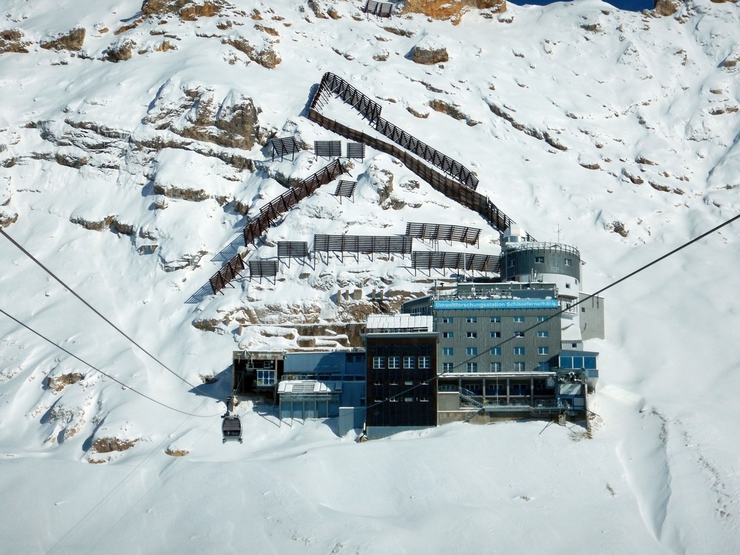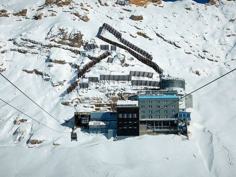 Im zweiten Teil der Exkursion stand die Umweltforschungsstation selbst im Mittelpunkt. Bei einer Führung durch das Haus gab es vom „Hausmeister der Forschungsstation“, wie er sich selbst nannte, spannende Einblicke in die Arbeit im Schneefernerhaus. Der „Hausmeister“ stellte sich dabei rasch als promovierter Geophysiker heraus, der über jedes Messinstrument Bescheid wusste und zu fast jedem Poster eine passende Geschichte parat hatte. Und davon gab es nicht gerade wenige: Zahlreiche Universitäten und Forschungseinrichtungen nutzen den guten Service und vor allem die hohe Lage des Schneefernerhauses für unterschiedlichste Forschungen: Angefangen bei der Untersuchung von Wolken bis hin zur Schadstoffmessung im alpinen Raum. In den Laboren und auf den Terassen stehen Messinstrumente dicht an dicht und es kommen immer mehr hinzu. Denn grundsätzlich darf (bei entsprechender Miete) jeder Versuche am Schneefernerhaus durchführen, solange er dabei nicht die Experimente anderer stört.
