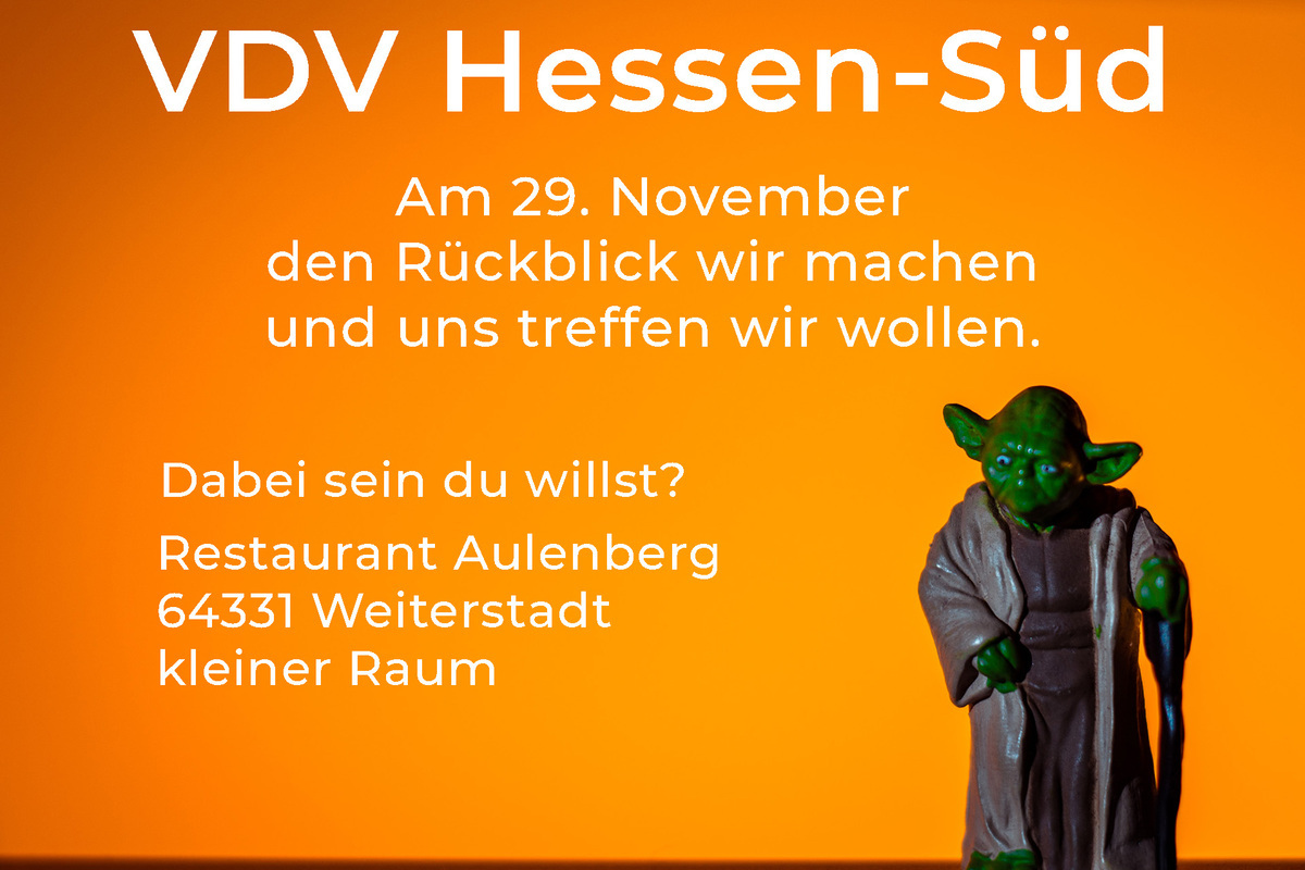 In geselliger Runde wollen wir das vergangene VDV-Jahr Revue passieren lassen. Eventuell besteht die Möglichkeit, Bilder über einen Beamer vorzuführen. Wer also Fotos vom vergangene Jahr hat, bitte diese auf USB-Stick mitbringen.