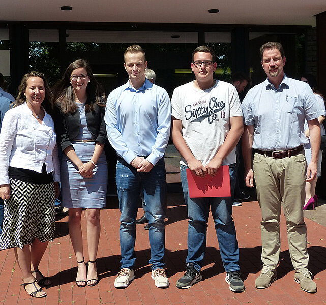Von den an diesem Tag im Mittelpunkt stehenden Absolventen wurden die drei Prüfungsbesten aus den beiden Ausbildungszweigen noch ganz besonders geehrt. Sina Kilz (Vermessungs- und Katasterverwaltung, Vermessungstechnikerin), Michael Böhme (Vermessungs- und Katasterverwaltung, Geomatiker) und Jan Hergenröther (Öffentlich bestellter Vermessungsingenieur Petry, Vermessungstechniker) wurden für ihre herausragenden Leistungen ausgezeichnet. Alle drei erreichten Prüfungsergebnisse mit mehr als 90 von Hundert möglichen Punkten – ein toller Erfolg!