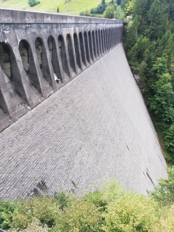 Mit etwas Zeitdruck ging es dann direkt weiter zur zweiten Station des Tages. Nach einer einstündigen Fahrt, die unter anderem direkt entlang des Walensees führte, erreichten wir den Wägitalstausee, der etwas südlich vom Ostende des Zürichsees liegt. Dort wurden wir schon von zwei Mitarbeitern des Kraftwerks für eine Führung durch die Staumauer erwartet. Die Staumauer wurde 1926 nach nur vier Jahren Bauzeit fertiggestellt. Sie ist als Schwergewichtsmauer ausgeführt, und war zur damalige Zeit mit 110 m Höhe eine der größten ihrer Art. Mit dem Bau der Mauer verbunden war auch eine größere Umsiedelung der zuvor im Tal lebenden Bevölkerung. Trotz zuvor gezahlter Entschädigungen wollten einige der Bewohner nicht an die Realisierung des Projekts glauben und verließen ihre Häuser erst als sie bereits knietief im Wasser standen. Im Gegensatz zum Reschensee wurde hier der Kirchturm vor der Flutung gesprengt. Der See fasst insgesamt 150 mio. m³ Wasser und wird über den Sommer aufgestaut. Ab Herbst folgt dann die Stromgewinnung, wobei die Absenkung des Seespiegels nur um maximal 20 m zulässig ist, um Hangrutschungen zu vermeiden.