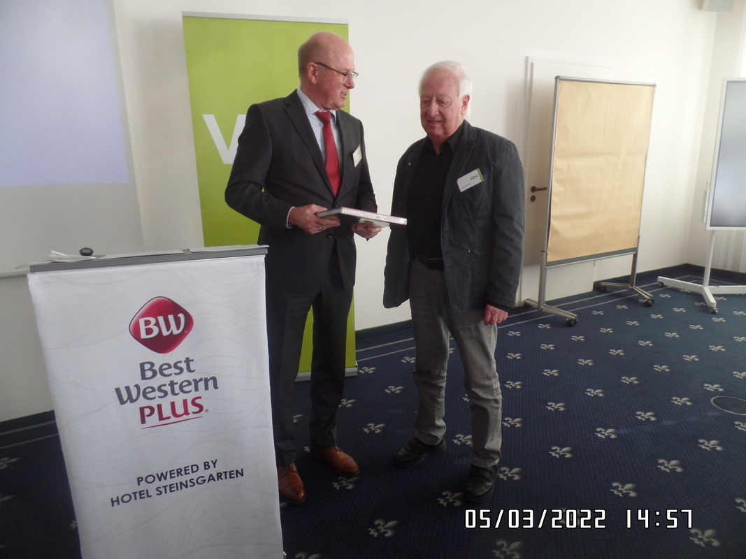 Der VDV Präsident Grunau freut sich darüber, dass er nach 2 Jahren wieder ein Grußwort in Präsenz an die Teilnehmer richten kann. Er hat als Präsident des ZBI auch die Koalitionsverhandlungen begleitet und die Bildung des neuen Bauministeriums sehr begrüßt. Er geht auf den neuen Verlag für das VDVmagazin ein und das damit verbundene neue Layout. Weiterhin erwähnt er die bevorstehende Verleihung des Bundesverdienstkreuzes an Horst Helmig. Er überreicht Helmig ein historisches Buch über die Landesvermessung in Preußen von 1884 als Dankeschön für die langjährige ehrenamtliche VDV Verbandsarbeit.