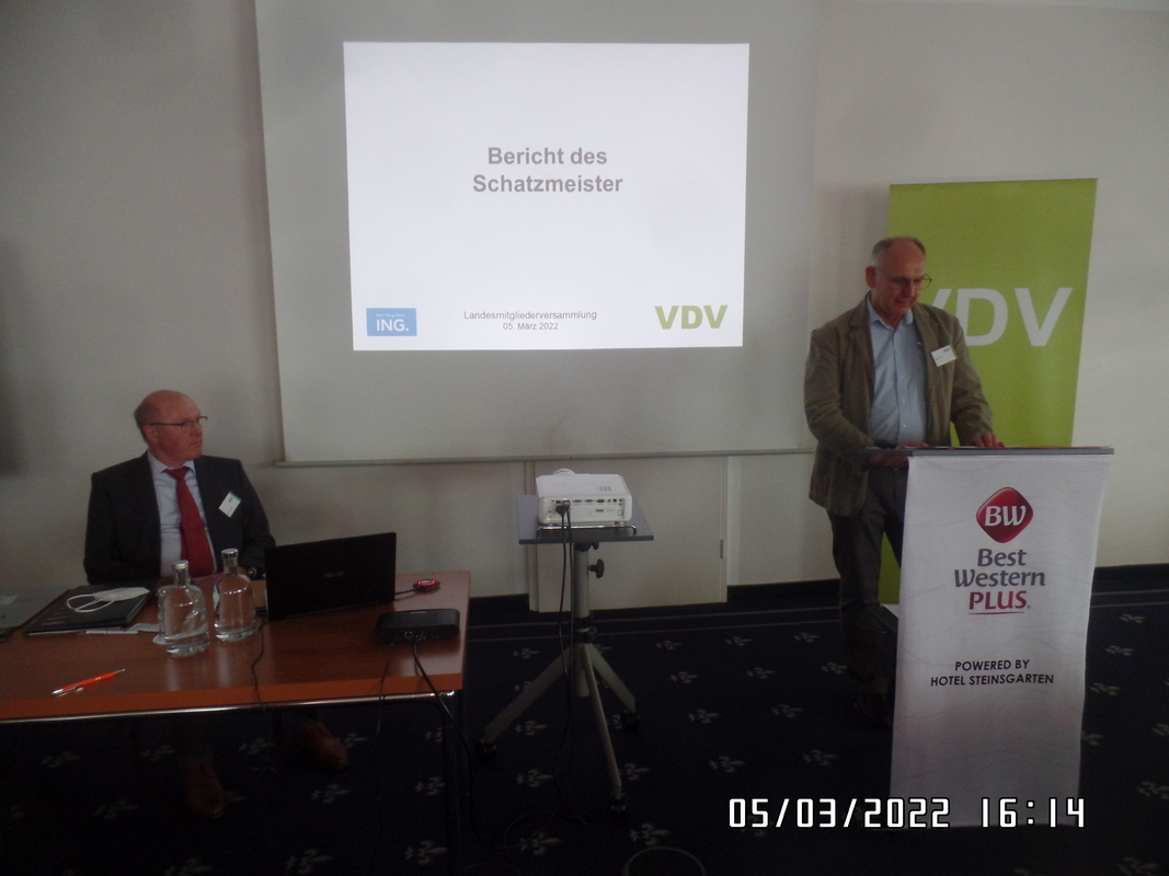 Der LV-Vorstand hat sich in zahlreiche Entwürfe zu Verordnungen und Gesetzen eingearbeitet und Stellungnahmen ausgearbeitet und abgegeben. Sitzungen VDV Finanzausschuss in Essen und mit Emailaustausch. An den Verleihungen des Goldenen Lotes in Köln teilgenommen. Wegen der Nachwuchsförderung Teilnahme an diversen Sitzungen in der IngKH und an Schulen im Rahmen von Bildungswochen. Die durchgeführten und geplanten Veranstaltungen der Bezirke vorgestellt.