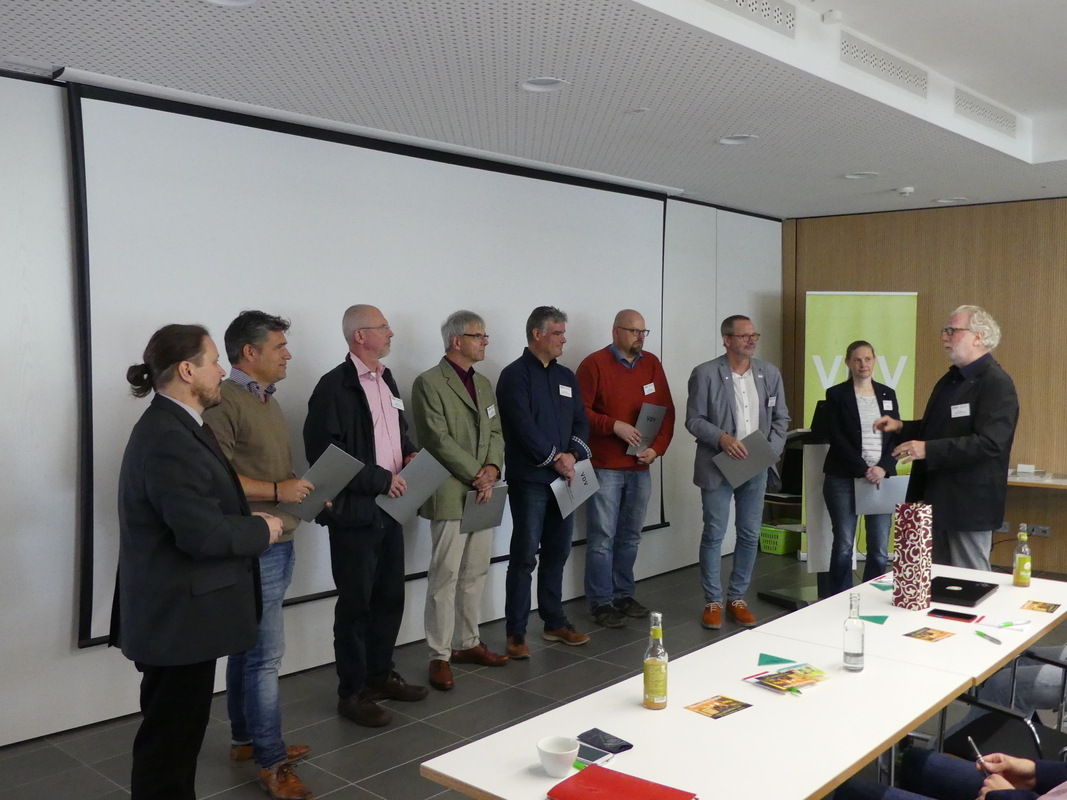 Im Rahmen des Tagesordnungspunktes Ehrungen wurden die anwesenden Kollegen Thomas Schmitt, Rolf Mensching, Hans-Joachim Krause, Bolko Hartenstein, Cord Husmann, Jürgen Rüffer (Allsat GmbH) und die Kollegin Wibke Dünkel für ihre 25-jährige Mitgliedschaft und Herr Dieter Grüner für seine 50-jährige Mitgliedschaft im VDV geehrt. Den Jubilaren wurden die Urkunden von Herrn Grunau und die Verbandsnadeln von Herrn Tschöke überreicht. Für die lange Treue zum Verband wurde ihnen gedankt. Den leider nicht anwesenden Jubilaren werden die Urkunden und Nadeln für 50-, 40- und 25-jährige Mitgliedschaft auf dem Postwege zugesandt.