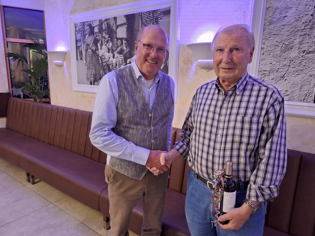 Begrüßt wurde auch der Landesvorsitzende Bernd Sack. Bernd Sack berichtete über Aktuelles aus den Aktivitäten des Landesvorstandes. Zudem gratulierte er dem Mitgründer des Bezirks Hessen-Mitte und vorherigen Bezirksvorsitzenden Dieter Schepp nachträglich zu seinem 80. Geburtstag und übergab dem Jubilar ein Wein-Präsent. Der Landesvorsitzende wünschte viel Gesundheit und bedankte sich für dessen Arbeit sowohl im Bezirks- als auch im Landesverband. 1971 gründete Dieter Schepp gemeinsam mit den Kollegen Horst H. Helmig, Erwin Jost und weiteren Kollegen den VDV-Bezirk Hessen-Mitte und übernahm die Funktion des Schriftführers und Kassenverwalters. Von 2001 bis 2011 übernahm er auch das Amt des Bezirksvorsitzenden und von 2011 bis 2023 des stellvertretenden Bezirksvorsitzenden. Ab 1996 war Dieter Schepp Mitglied des erweiterten Landesverbandsvorstandes und übernahm bis 2012 das Amt des Referenten für Gesetzgebung und anschließend auch für den öffentlichen Dienst.