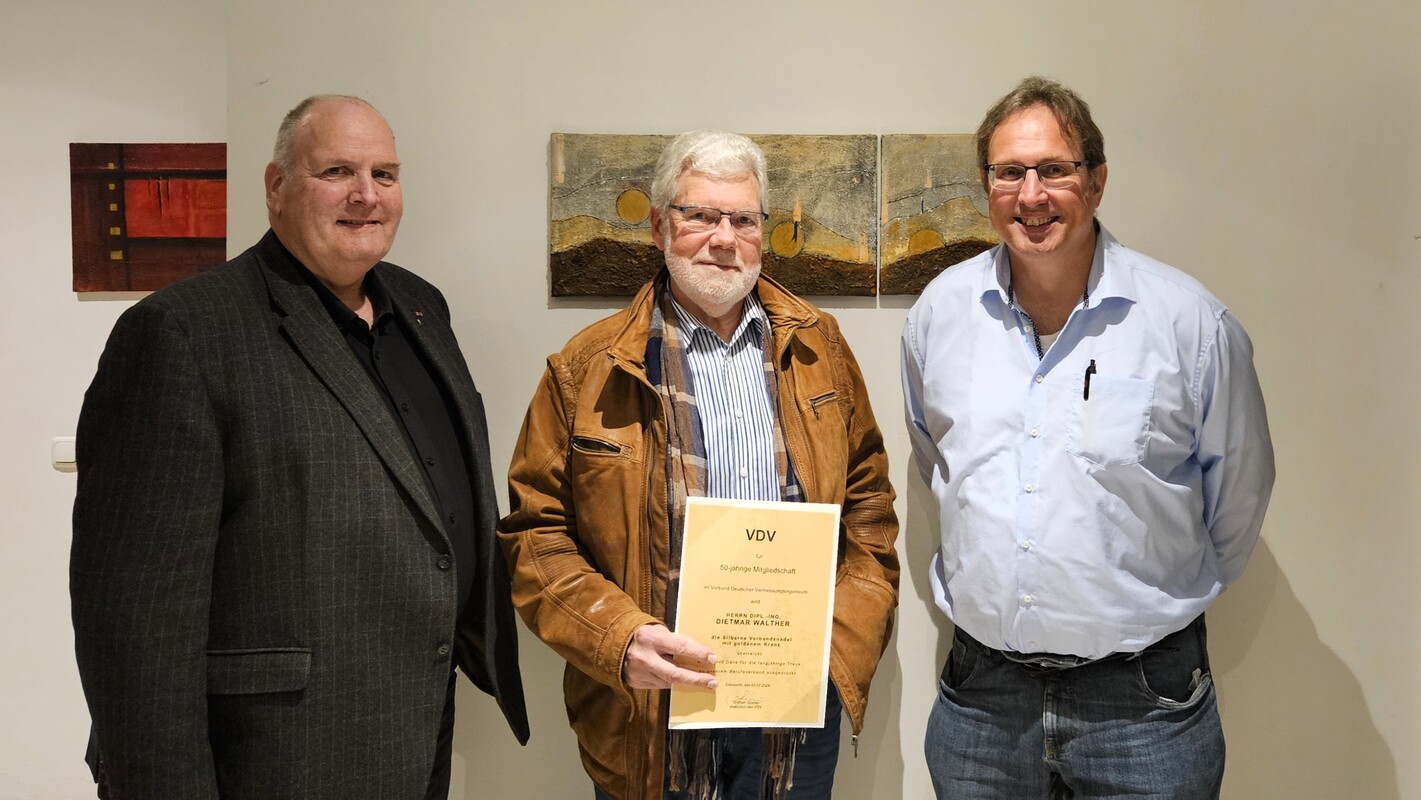 Nach Beendigung der Wahlen stand dann noch eine persönliche Ehrung an. Der Kollege Dietmar Walther wurde für seine 50-jährige Verbandsmitgliedschaft durch die Aushändigung einer Urkunde und der silbernen Verbandsnadel mit goldenem Kranz für seine langjährige Verbandstreue geehrt.
