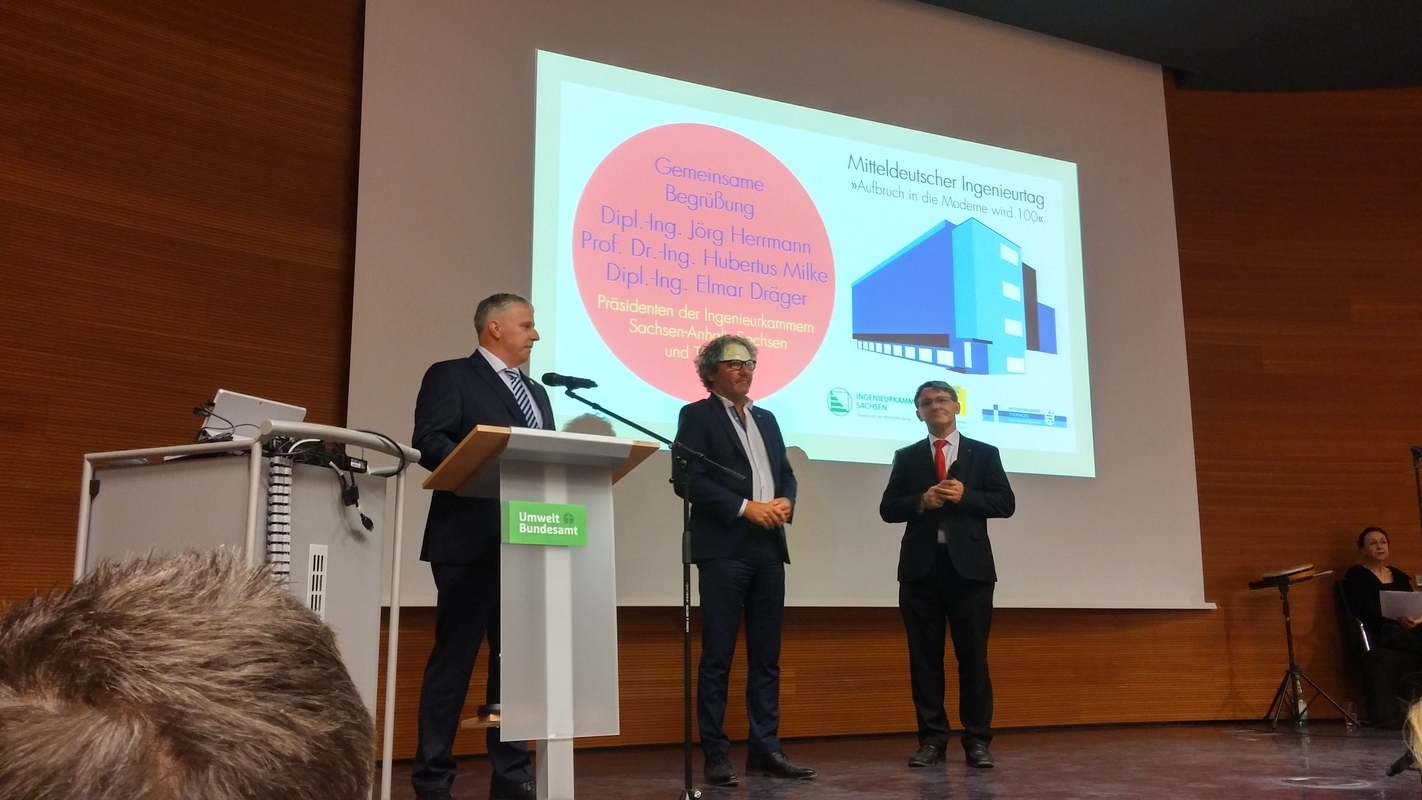 Die eigentliche Festveranstaltung fand am 28.06.19 im Umweltbundesamt (UBA) in Dessau-Roßlau statt. Während die hervorragende Pausenverpflegung im weiträumigen Foyer stattfand war ein großer klimatisierter Hörsaal für die Festreden gewählt worden. Als Moderator führte Stefan Bernschein vom MDR durch das Event. Es begann mit der Begrüßung durch die Präsidentin des UBA Maria Krautzberger. Es folgten die Präsidenten der Länderingenieurkammern, Dipl. Ing. Jörg Herrmann (Sachsen-Anhalt), Prof. Dr.-Ing. Hubertus Milke (Sachsen) und Dipl.-Ing. Elmar Dräger (Thüringen). Das Grußwort der Gastgeberstadt sprach der Oberbürgermeister von Dessau-Rosslau Dipl.- Ing. Peter Kuras. Er erwähnte die vor Kurzem stattgefundene Enthüllung eines Denkmals für Hugo Junkers. Hugo Junkers ist ein bekannter Dessauer Industrieller, seinem kreativen Schaffensprozess sind viele intuitive Produkte zu verdanken. Diese können bei einem Besuch im Hugo Junkers Museum bestaunt werden. Aufgrund der vielen Ingenieure im Publikum sagte Oberbürgermeister Kuras mit einem Augenzwinkern: „Man kann als Dipl.-Ing. einiges werden z. B. Oberbürgermeister.“