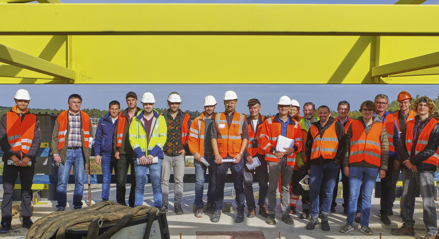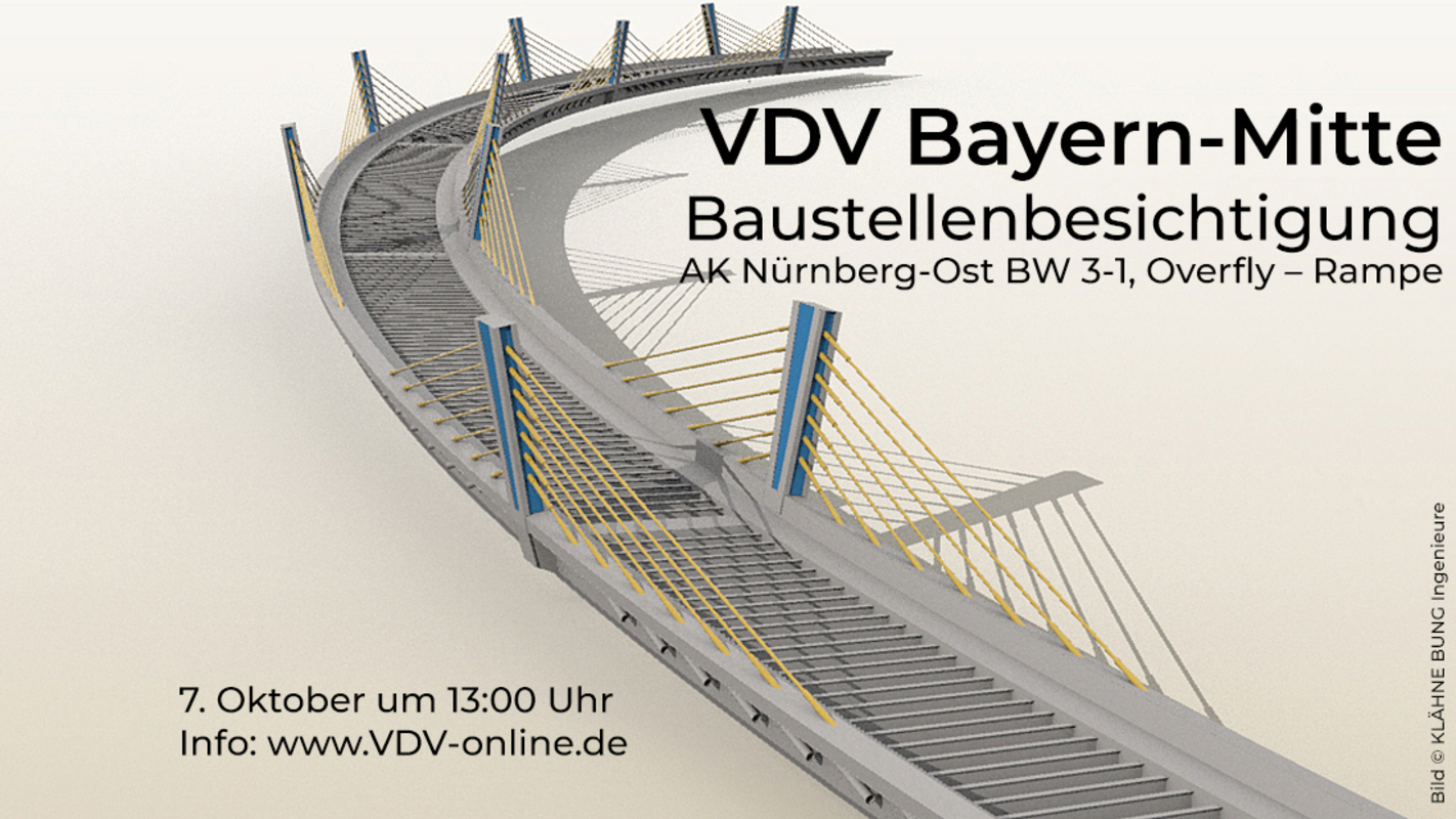 Zu dem Großprojekt „Umbau des AK Nürnberg-Ost“ gehört der sog. Overfly, ein Überführungsbauwerk, das als halbdirekte Rampe den Verkehr von Heilbronn in Richtung Berlin über das AK Nürnberg-Ost führt. VDV-Kollegen, Studenten und Interessierte erlebten auf Einladung des Bezirks Bayern Mitte eine hautnahe Führung zu diesem spannenden Projekt.