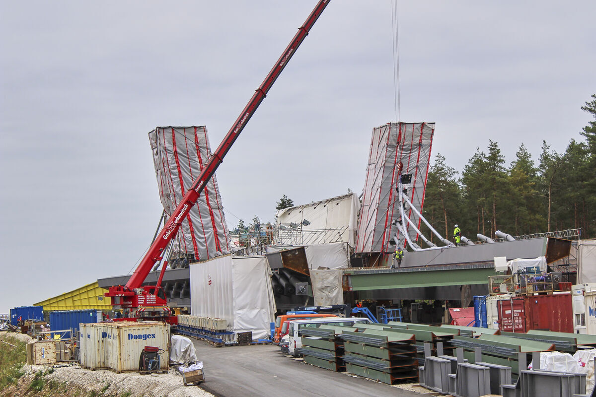 Die Besonderheit bei dieser Brücke besteht darin, dass fünf Pylone mit 15 m Höhe in den Überbau eingespannt werden und die harfenförmigen Schrägseile bereits vor dem Verschub vorgespannt werden. So kann die „fertige“ Brücke ohne Hilfspfeiler und minimalen Eingriff in den laufenden Verkehr hergestellt werden.