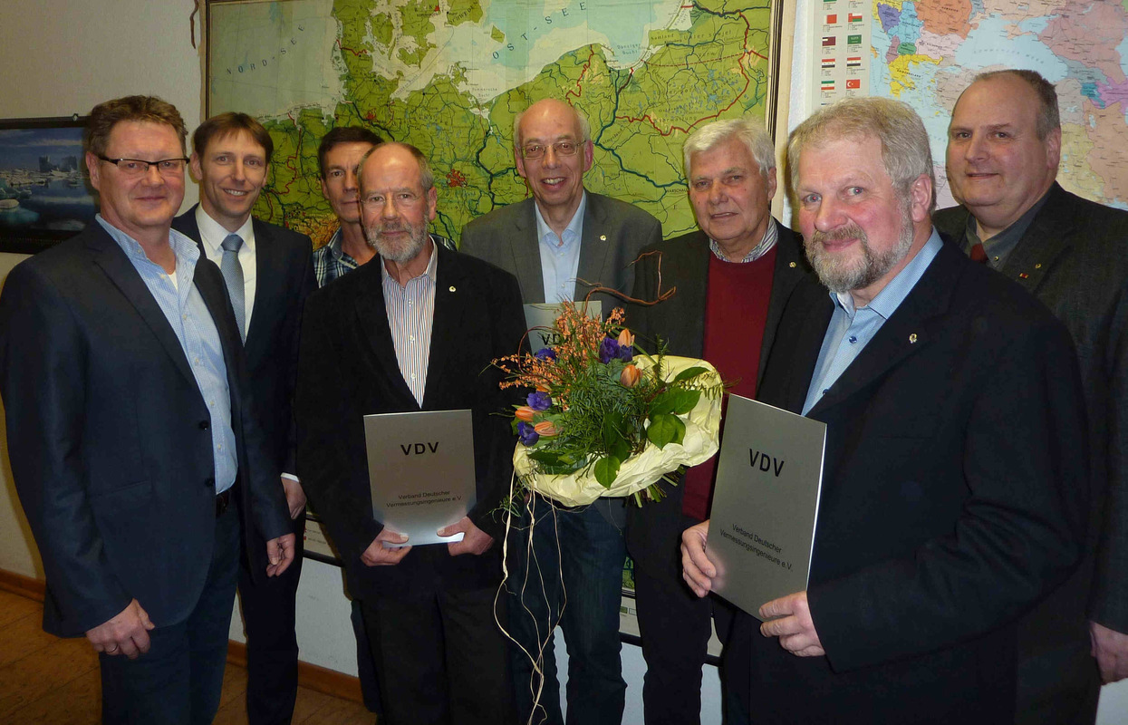 Im Rahmen des alljährlichen Neujahrsempfangs am 12.01.2016 konnte der Bezirksvorsitzende Uwe Deppe wieder eine große Anzahl von Mitgliedern begrüßen. In den Räumen des Vermessungsbüros Massong überreichten Ulf Meyer-Dietrich und Burkhard Kreuter Urkunden und Ehrennadeln für die langjährige Mitgliedschaft im VDV. Für 50-jährige Mitgliedschaft wurde Paul Morchner geehrt. Seit 40 Jahren sind Bernhard Beckhoff, Meinolf Büscher und Ulrich Gaesing im VDV aktiv. Für 25-jährige Mitgliedschaft dankte Ulf Meyer-Dietrich Bernd Porath und Peter Maschewski. Ulf Meyer-Dietrich betonte die Bedeutung der Mitgliedschaft in einem Berufsverband. Berufsverbände wirken bei vielen Entscheidungen zur Berufsausübung gestaltend mit. Aber auch der fachliche Austausch zwischen Kollegen aus völlig unterschiedlichen Arbeitsbereichen stellt für jeden persönlich eine Bereicherung dar. Er ermunterte die Kollegen und Kolleginnen junge Nachwuchskräfte anzusprechen und auf die Qualitäten der Mitgliedschaft in einem Berufsverband hinzuweisen.
