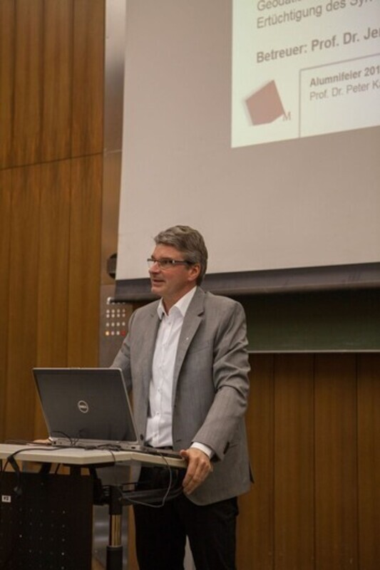 Am Ende der Prämierung durfte der Absolvent den zahlreichen Zuhörern des vollbesetzten Audimax-Hörsaals noch auf persönlich gestellte Fragen Einblicke in seinen Werdegang bis zum Bachelorabschluss und in seine Zukunft als Vermessungsingenieur im Ingenieurbüro geben.