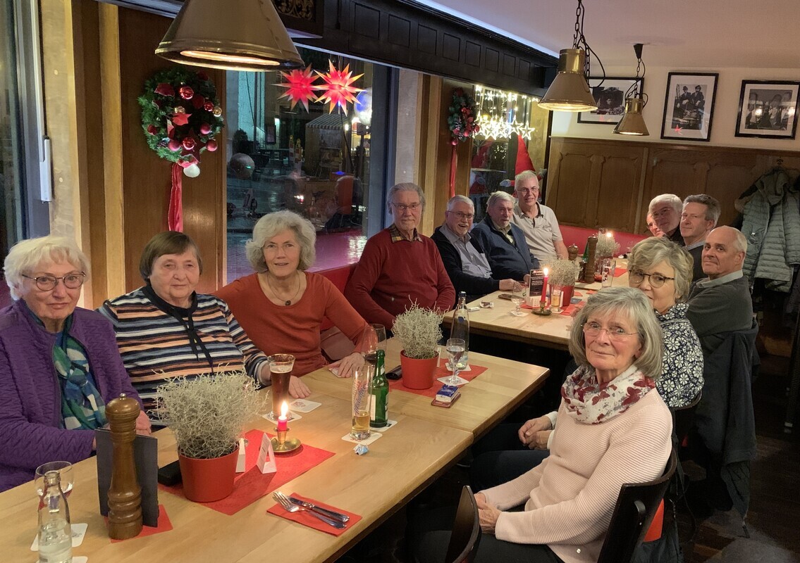 Nach langer Sommerpause hatte der Bezirk Essen am leicht verregneten Dienstag, dem 12.12.2023, zu einem Jahresabschluss-Bummel über den Essener Weihnachtsmarkt eingeladen. Pech gehabt, könnte man meinen, aber trotz des Wetters und einiger Ausfälle durch Corona, trafen sich die Teilnehmer vor dem Essener Dom. Auf das Bummeln wurde dann aber großzügig verzichtet und stattdessen zügig in die wenige Meter entfernte badischen Glühwein-Bude, neben der alten Marktkirche, gewechselt. Den unverzichtbaren, aber in diesem Fall ausgesprochen leckeren Glühwein, gab es sowohl in Rot als auch in Weiß, mit und ohne Alkohol, ausschließlich sortenrein, ohne zusätzlichen Zucker und Schuss. Seinen edlen badischen Tropfen zu panschen, das lehnte die Chefin erbarmungslos ab. Dank heimlicher, unautorisierter Nachbesserung konnte dann aber auch Dieter sein Getränk genießen.