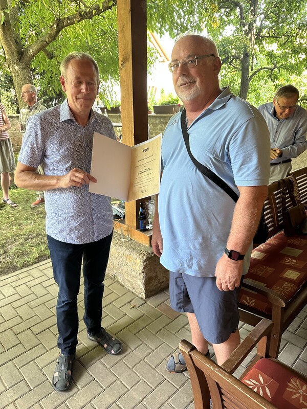 Zum Abschluss seines Berichtes wies der Landesvorsitzende Dipl.-Ing. Gerald Heilwagen noch darauf hin, dass der VDV-Thüringen mit diesem Sommerfest nicht nur einfach ein jährliches Zusammentreffen feiert, sondern auch sein 35-jähriges Bestehen. Der VDV-Landesverband Thüringen wurde am 28.04.1990 im hessischen Hohenroda gegründet. Dass Gerald Heilwagen genauso lange, also seit der Gründung, Landesvorsitzender des VDV in Thüringen ist, sei an dieser Stelle der Vollständigkeit halber erwähnt!
