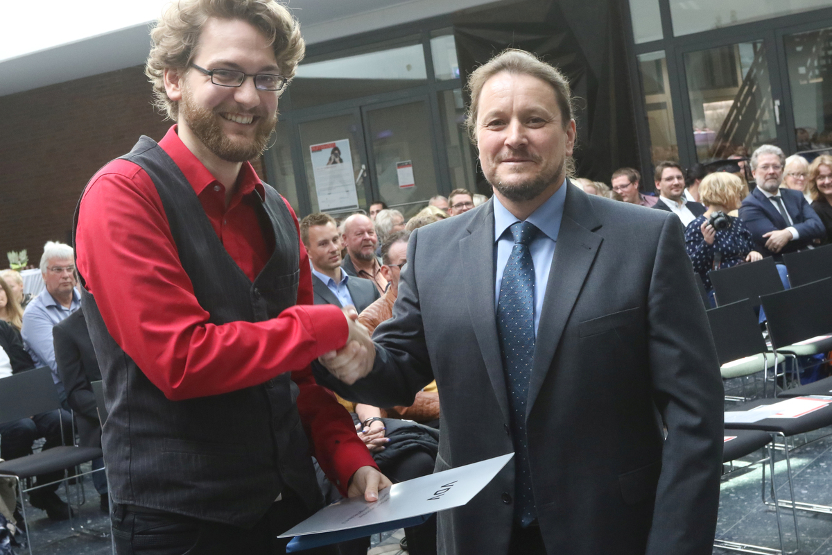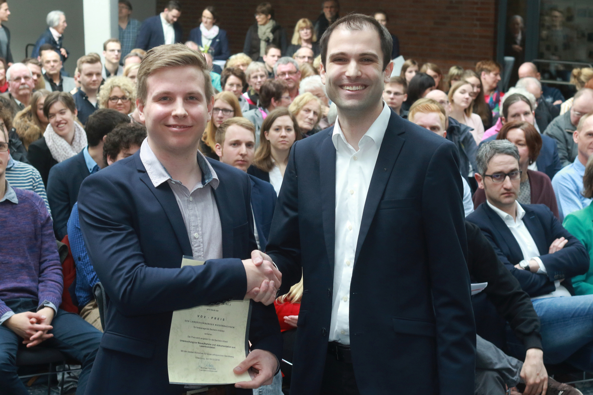 Am 09. März 2018 wurde Herr Dennis Schröder für seine Bachelorarbeit zum Thema "Untersuchung zur Bauaufnahme und -dokumentation aus Laserscandaten" durch den VDV-Bezirksvorsitzenden Weser-Ems Jelde Borgmann ausgezeichnet.