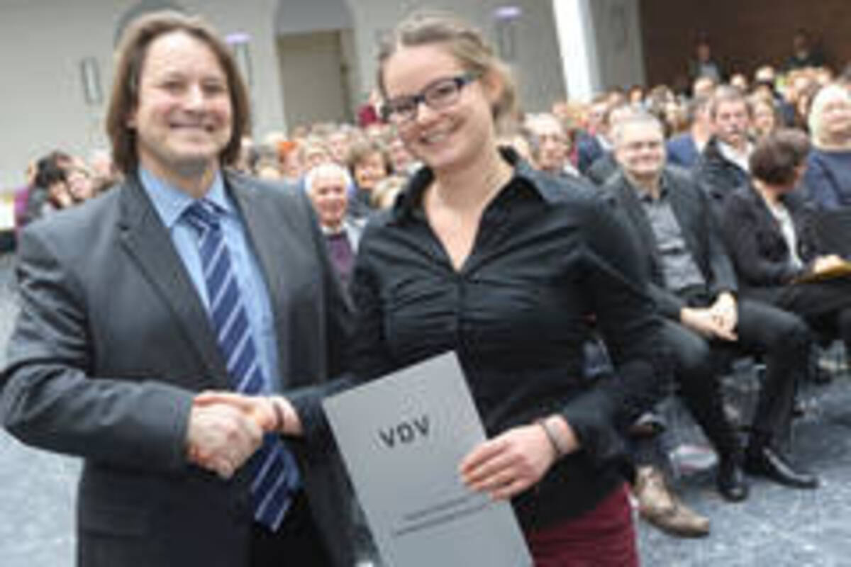 Den Landespreis des Verbandes Deutscher Vermessungsingenieure e.V. übergab der Vorsitzende Michael Tschöke an Tomke Jantje Lambertus vom Studiengang Angewandte Geodäsie für ihre Bachelor-Arbeit zum Thema „Realisierung und Nutzen eines auf Intensitätswerten basierenden stochastischen Modells für Schätzverfahren zur geodätischen Überwachung von Bauwerken mit terrestrischen Laserscannern“ (Erstprüfer: Prof. Harry Wirth).