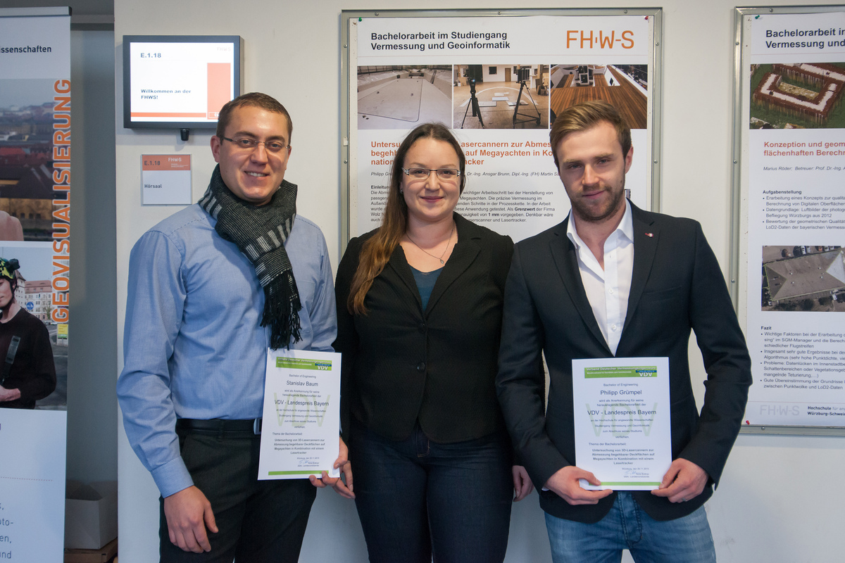 Als Mitveranstalter übergab auch in diesem Jahr der VDV den Preis für eine herausragende Bachelorarbeit. Prämiert wurden Herr Philipp Grümpel und Herr Stanislav Baum. Das Thema der Bachelorarbeit war „Untersuchung von 3D-Lasercannern zur Abmessung begehbarer Deckflächen auf Megayachten in Kombination mit einem Lasertracker“. In der Arbeit wurde der Einsatz eines Laserscanners für die Abmessung begehbarer Deckflächen von Megayachten getestet. Die präzise Vermessung ist ein wichtiger vorbereitender Arbeitsschritt bei der Herstellung von passgenauen Teakholzböden und liefert die Grundlage für alle folgenden Schritte in der Kette des Fertigungsprozesses. Als Grenzwert wurde für die Einmessung eine Genauigkeit von 1 mm vorgegeben. Das Fazit der Arbeit ergibt, dass ein Einsatz des Laserscanners bei der Schiffsvermessung denkbar ist. Im Zuge der Untersuchung wurde aber nachgewiesen, dass die Genauigkeit abhängig von der Farbe der Oberfläche ist. Auch die exakte Vermessung von Kanten stellte sich als problematisch heraus, da die Anzahl der Messpunkte abhängig von der Erhebung der zu erfassenden Kante ist. Wegen dieser Faktoren wird die Durchführung der Messungen in Kombination mit Lasertracker empfohlen, um die Genauigkeitsanforderungen sicher zu erfüllen.