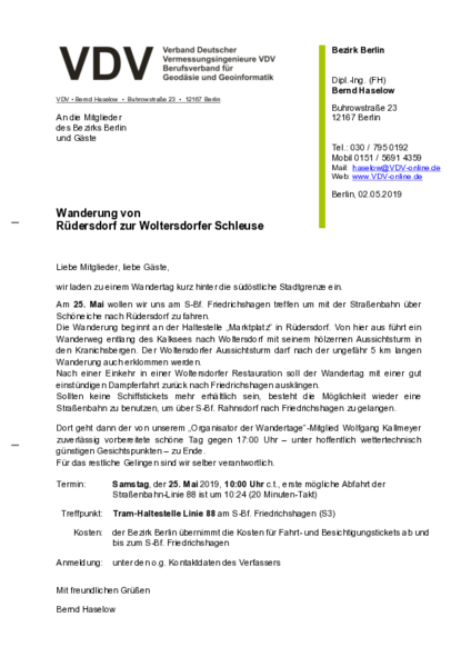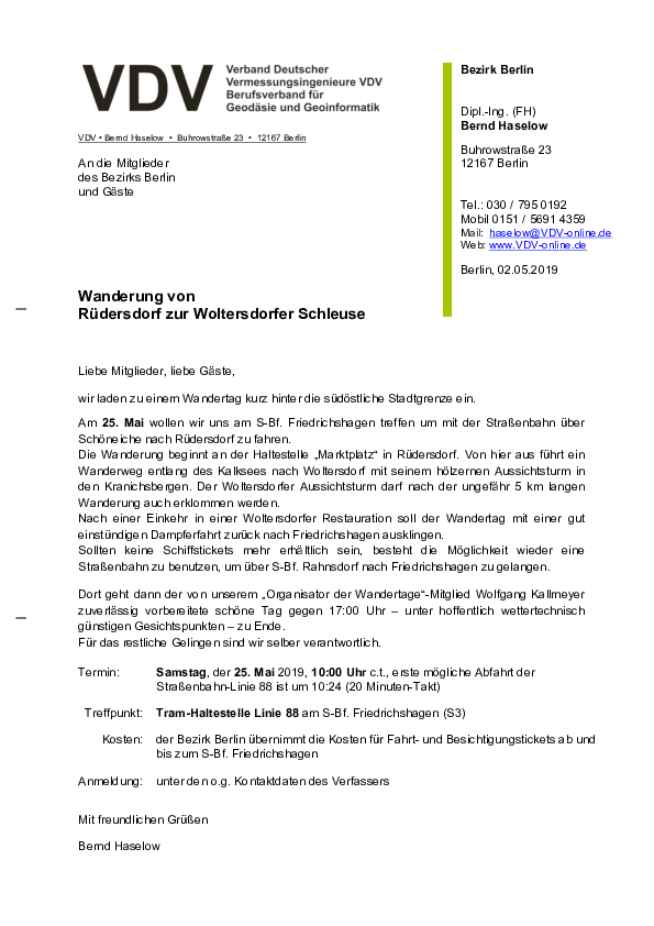 Am 25. Mai wollen wir uns am S-Bf. Friedrichshagen treffen um mit der Straßenbahn über