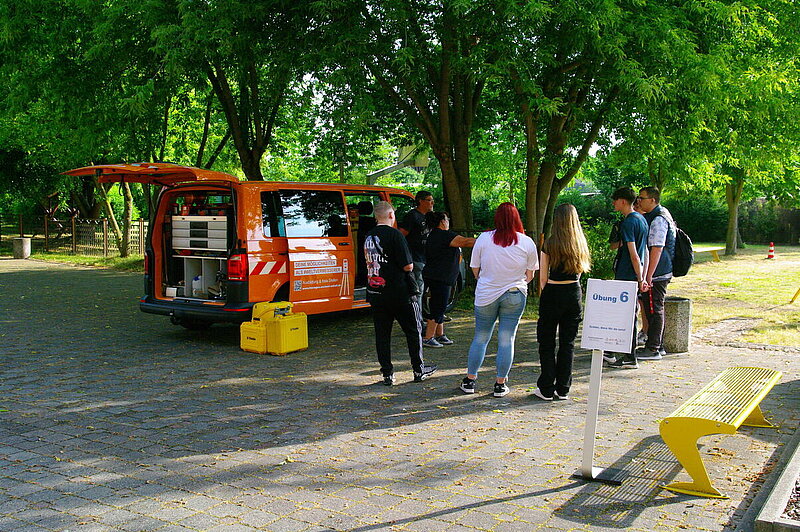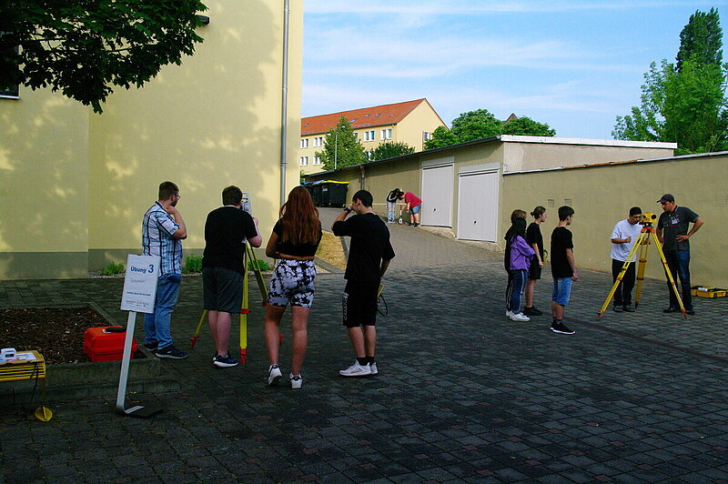 Im Rahmen zweier Schulprojekttage wurden am 20. und 21. Juni 2023 erstmalig in Sachsen-Anhalt rund 70 Schülerinnen und Schülern durch aktive Mitgestaltung an insgesamt 6 Stationen gezeigt, wie vielfältig der Beruf des Geodäten / Geomatiker sein kann. Es wurde bildlich und auch für die Schüler zum Anfassen mit praktischen Übungen erläutert, wie unterschiedlich die Welt erfasst und vermessen wird, wie die erzeugten Geodaten anschließende verarbeitet, analysiert und veredelt und zum Schluss mit digitalen Karten und Geländemodellen diese visualisiert und abgebildet werden. Folgende Übungen wurden jeweils in ca. 40 min. Slots allen Schülern angeboten, wobei jeweils auch Hand angelegt werden konnte: