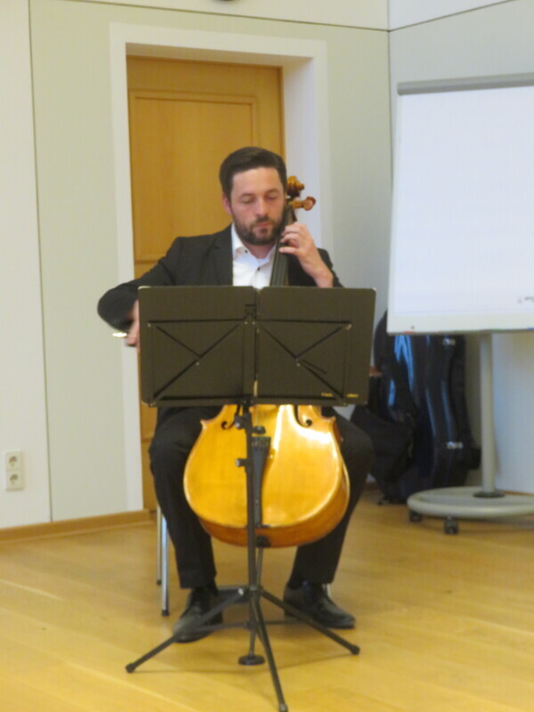 Dazu waren ebenfalls wieder Vertreter von Berufs-Verbänden/-Verein eingeladen. Kulturell umrahmt wurde die Festveranstaltung durch einen Allein-Unterhalter, einen jungen Musiker und Cello-Solisten mit seinem Kontrabass, einer großen Bassgeige. Von angemessener festlich-klassischer Musik reichten seine Darbietungen bis hin zu modernen Interpretationen.